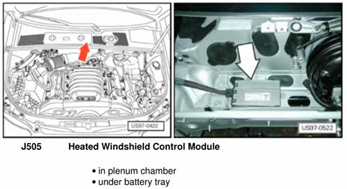 | Heated Windshield Control Module | In right side of plenum chamber, under battery tray. See Figure. |