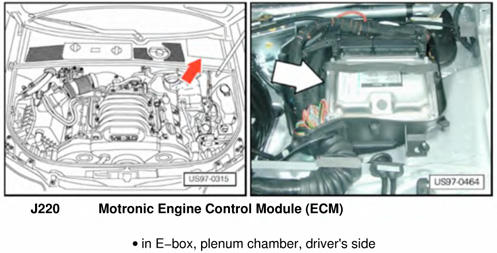 | Motronic Engine Control Module (ECM) | In E-box, in plenum chamber. See Figure. |