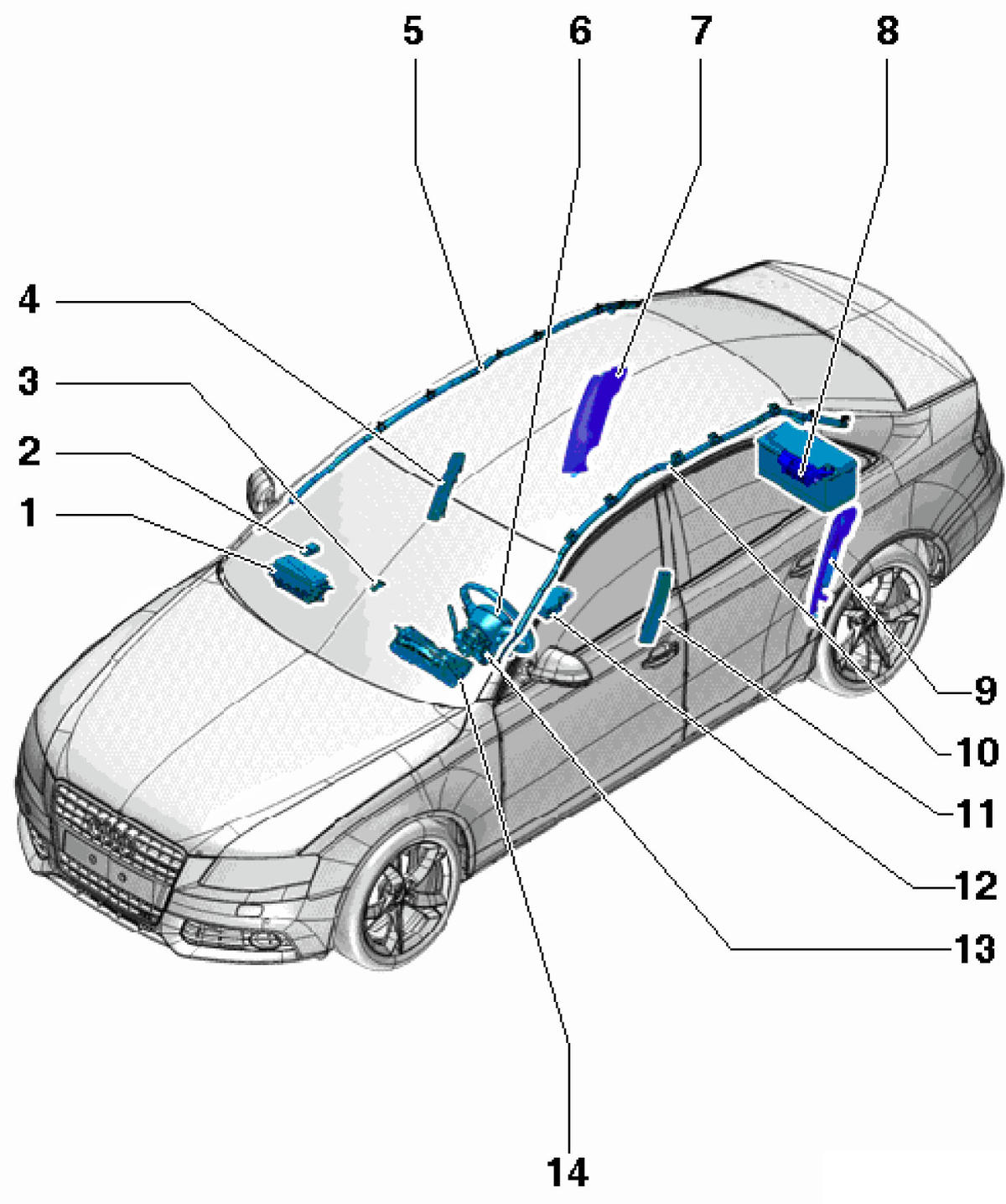 | Air Bag Control Module (12) | Below center console. See Figure. |