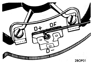 2. The diodes may be tested at this point, prior to further disassembly. Care should be exercised with insulating bushings under positive diode carrier. To remove negative carrier, extract threaded studs. When one rectifying diode has been damaged due to short circuiting, the three complementing diodes must be replaced also. Unscrew nuts on both "B+" terminal bolts and lift positive diode carrier (heat sink) up and back.