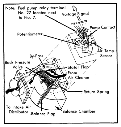 An air flow meter, mounted between the throttle chamber and air cleaner, is the major control unit in addition to the ECU. The air flow to the engine is monitored by the ECU and fuel is adjusted accordingly by timing injector delivery. Injector delivery is based upon amount of intake air required for one engine rotation. The AFC system maintains constant fuel pressure and maintains proper air/fuel mixture by adjusting quantity of fuel to amount of intake air.