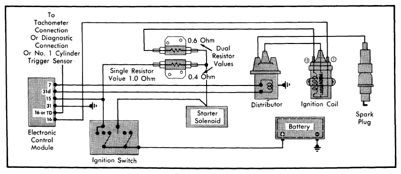 The Bosch electronic ignition system consists of a control module, a breakerless distributor, a single or dual resistor (some models may use a resistor wire, Mercedes-Benz models do not use any resistors), a high output ignition coil, an ignition switch and battery. Standard centrifugal and vacuum advance/retard mechanisms are used. See Figure and Figure.