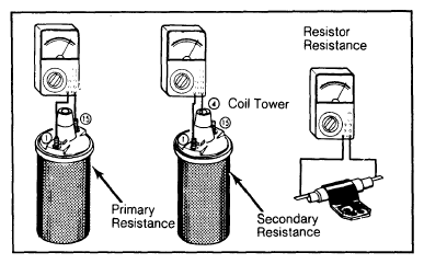 Set an ohmmeter in the low scale. Be sure ignition switch is "OFF". Check resistance of each resistor in the primary circuit. See Figure. Some manufacturers use resistor wires instead of ballast resistors. Most use 2 ballast resistors.