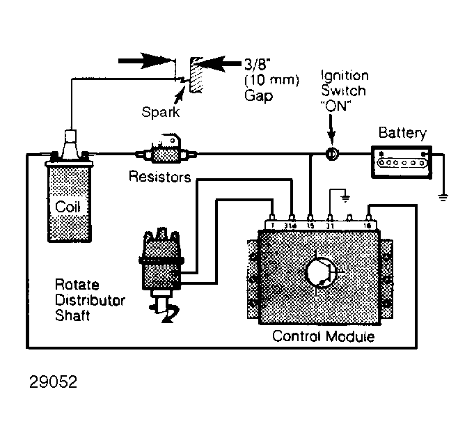 - If spark jumps gap, check distributor cap, rotor, cables, and spark plugs. Be sure ignition timing and fuel system are okay. If no sparks occur, perform the following tests.