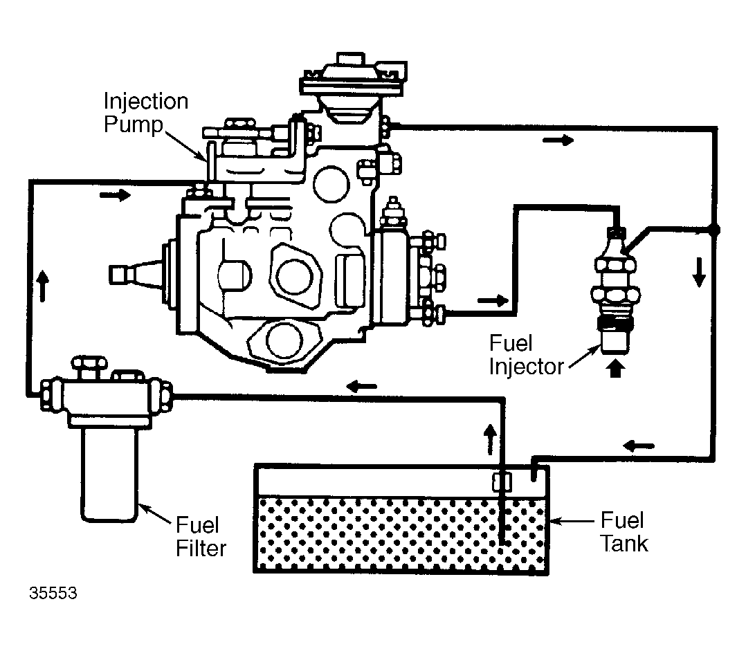 A vane-type fuel pump, built into the injection pump, supplies fuel from tank to fuel filter and then to injection pump. Injection pump supplies fuel to nozzles under high pressure. Excess fuel is returned to fuel tank by return lines.