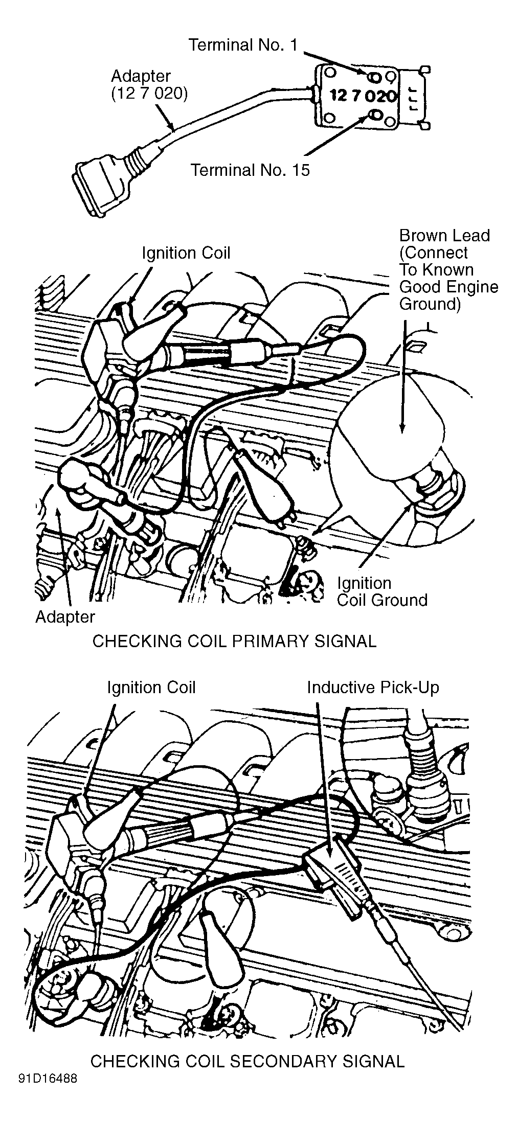 - Connect adapter to ignition coil of cylinder being tested. Red lead is not used as only one cylinder can be measured. Engine speed displayed will be reduced by a factor of 4. Produce stopped signal on oscilloscope by pressing "R" button on tester. Combustion voltage line will be very erratic on oscilloscope pattern (this is normal).