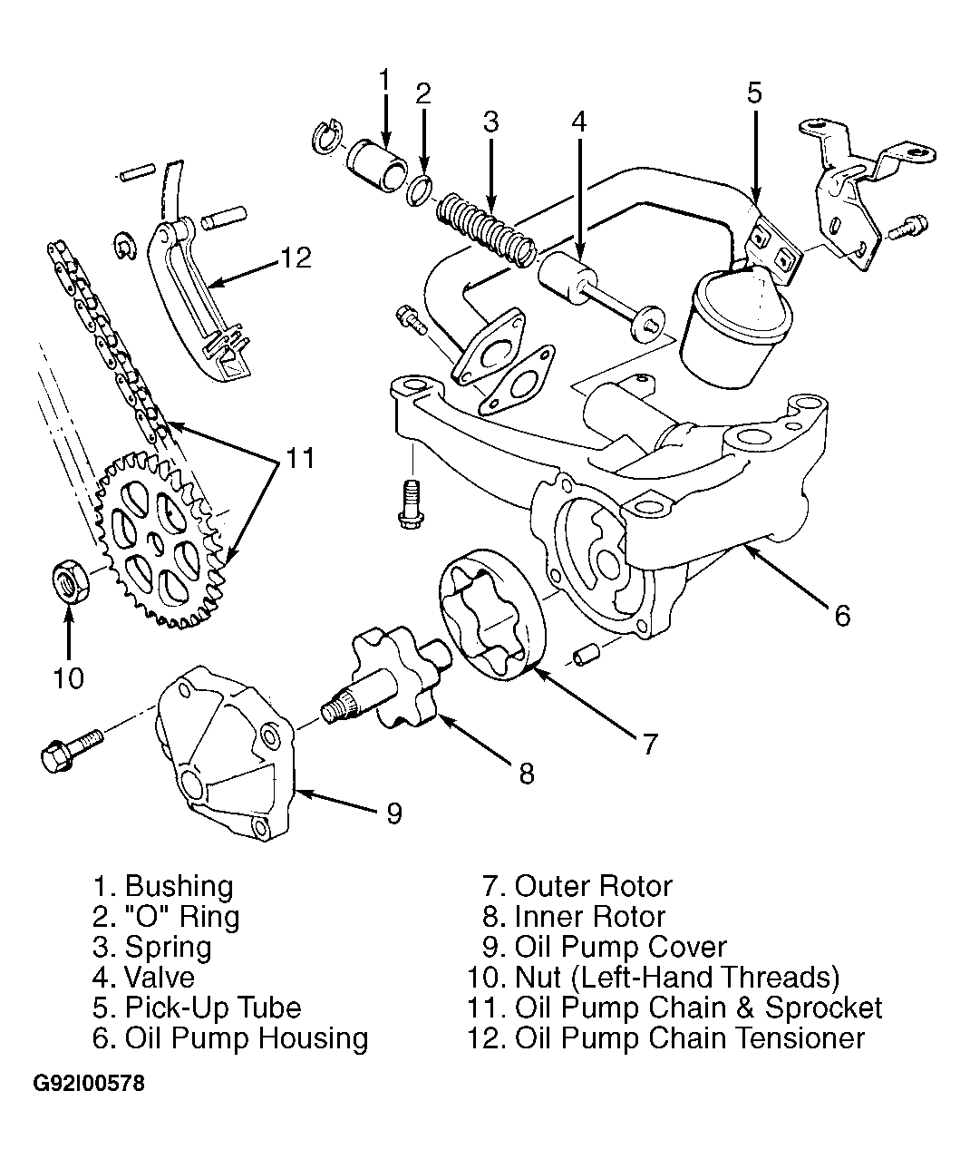 Oil pump is a rotary-type oil pump. Oil pump is bolted to engine block and driven directly from crankshaft by a single-roller chain and tensioner. See Figure. Oil filter is mounted vertically on intake side of engine.
