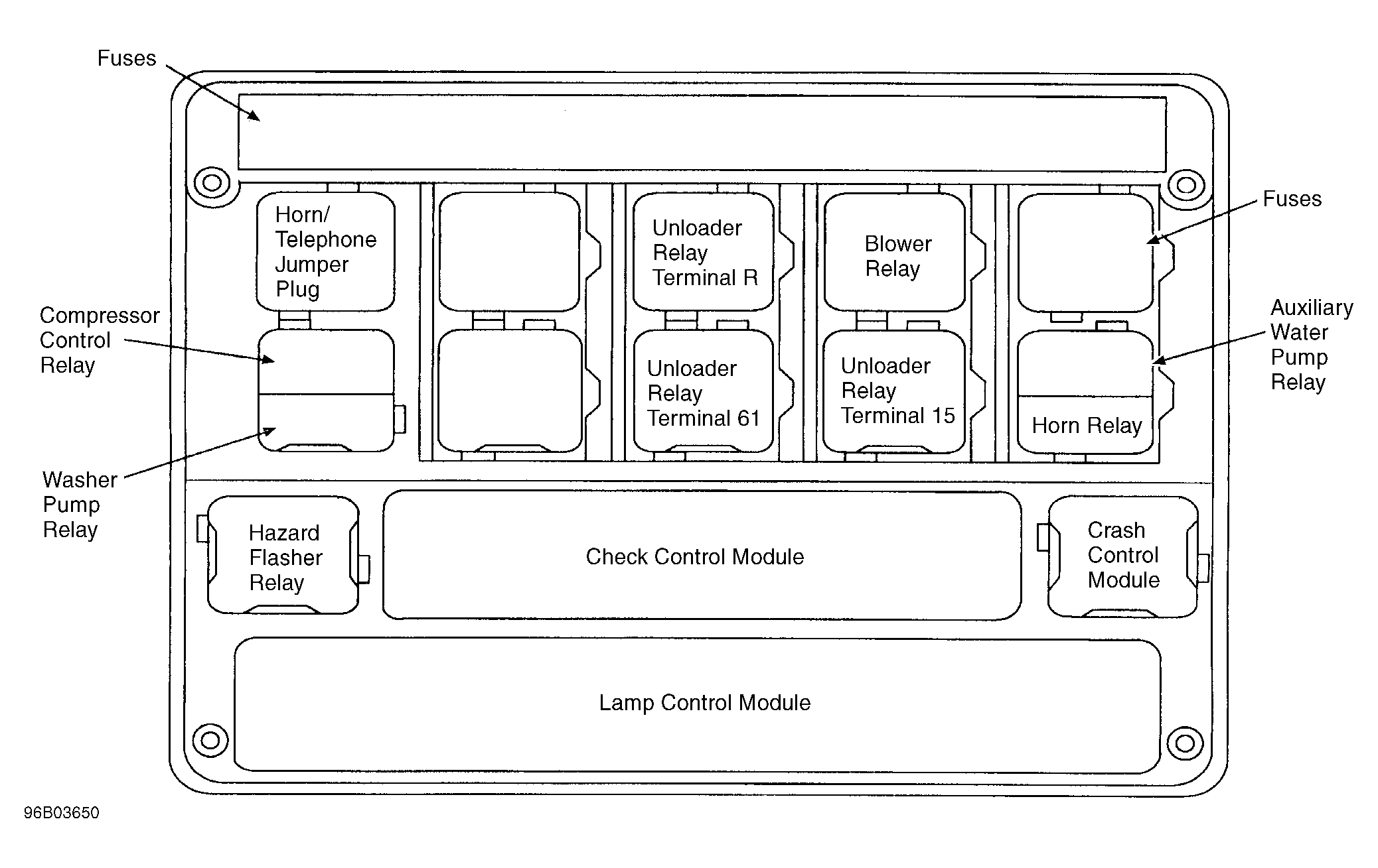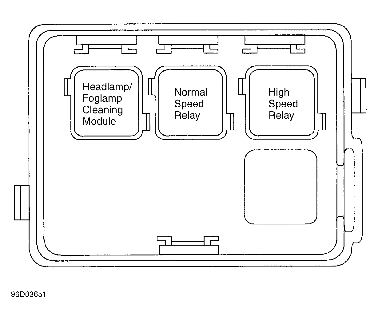 | Headlamp/Foglamp Cleaning Module | In auxiliary relay box. See Figure . |