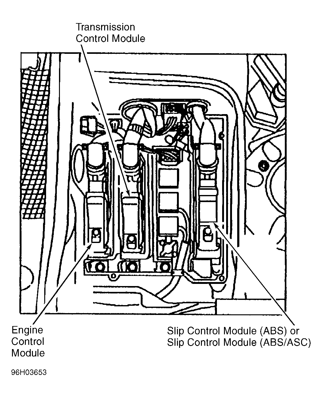 | Slip Control Module (ABS) | In E-box, behind right front shock tower. See Figure . |