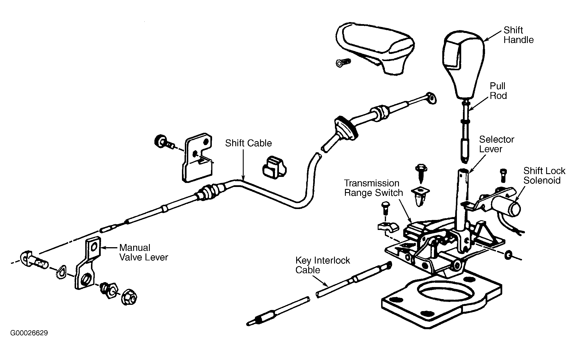Transmission is equipped with a electronically controlled shift lock and cable operated key lock system. See Fig 1 . Shift lock system prevents shift lever from being moved from Park unless brake pedal is depressed. Key lock system prevents ignition key being moved from "1" to "0" position on ignition switch unless shift lever is in Park.