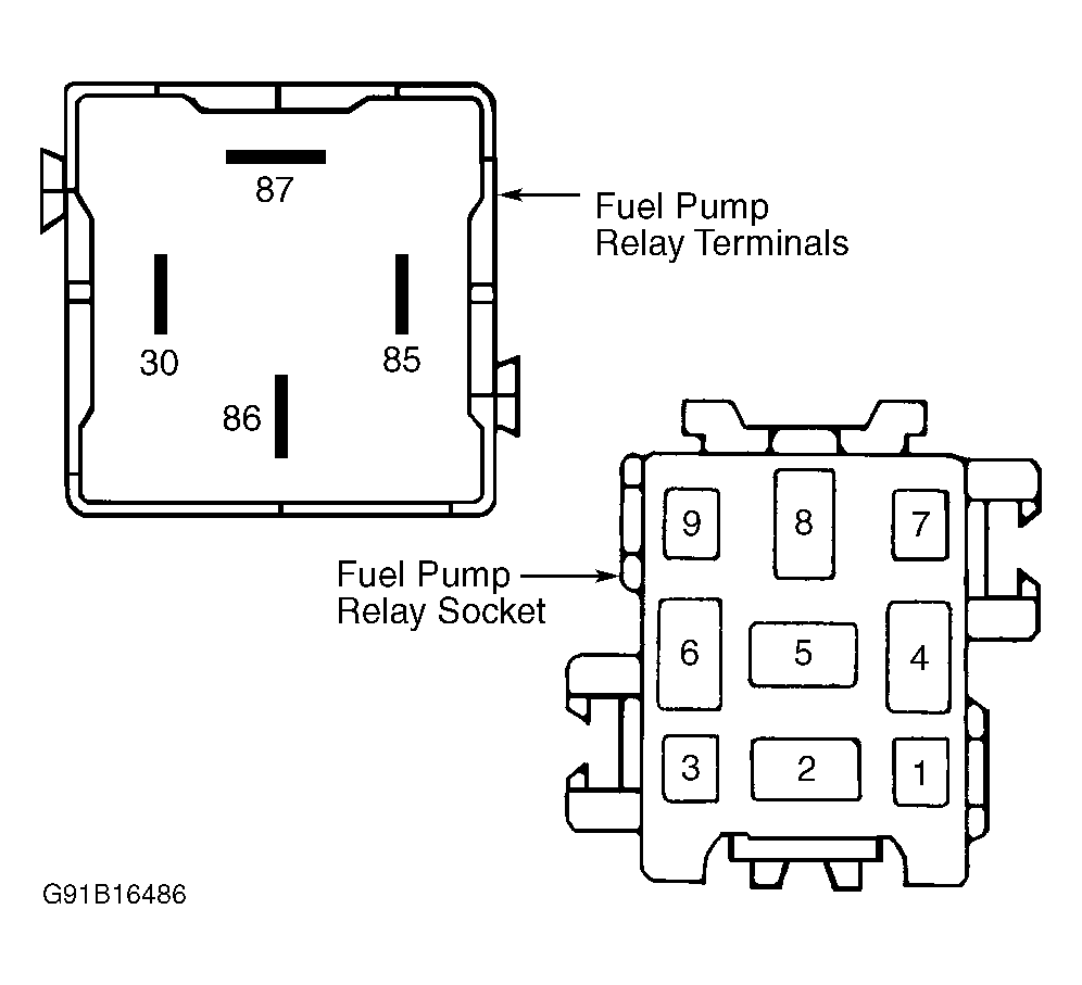 2. Remove fuel pump relay. See DME & FUEL PUMP RELAY LOCATION table. Using Fuel Pump Relay Bridging Caliper (613050) or jumper wire, connect terminals No. 87 and 30 at fuel pump relay socket. See Figure . This will turn fuel pump on.