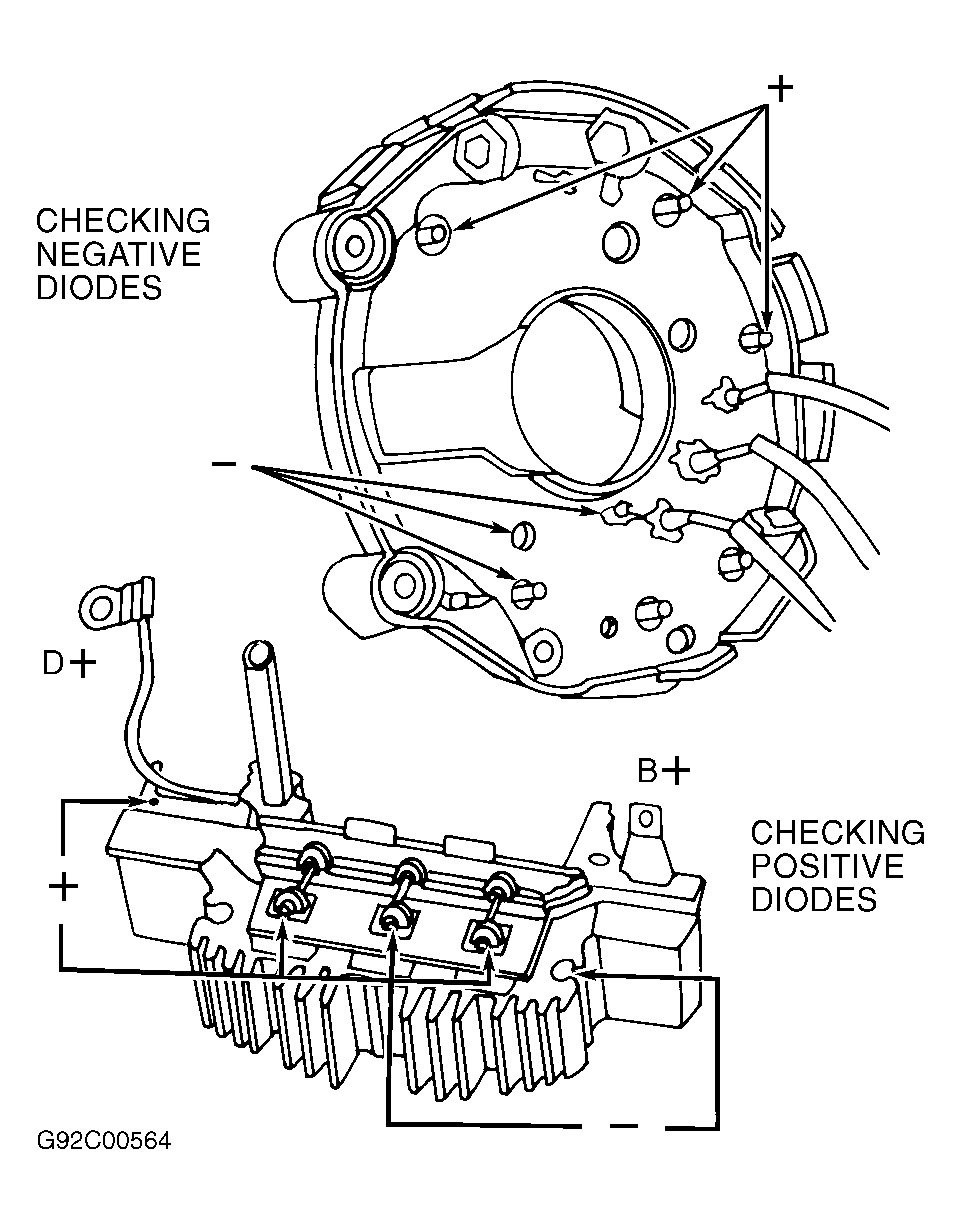 3. Connect DVOM leads, in turn, between D+ terminal and each of the 3 stator terminals. Reverse leads. DVOM should indicate continuity in one direction only. Replace diode assembly if continuity is not as specified.