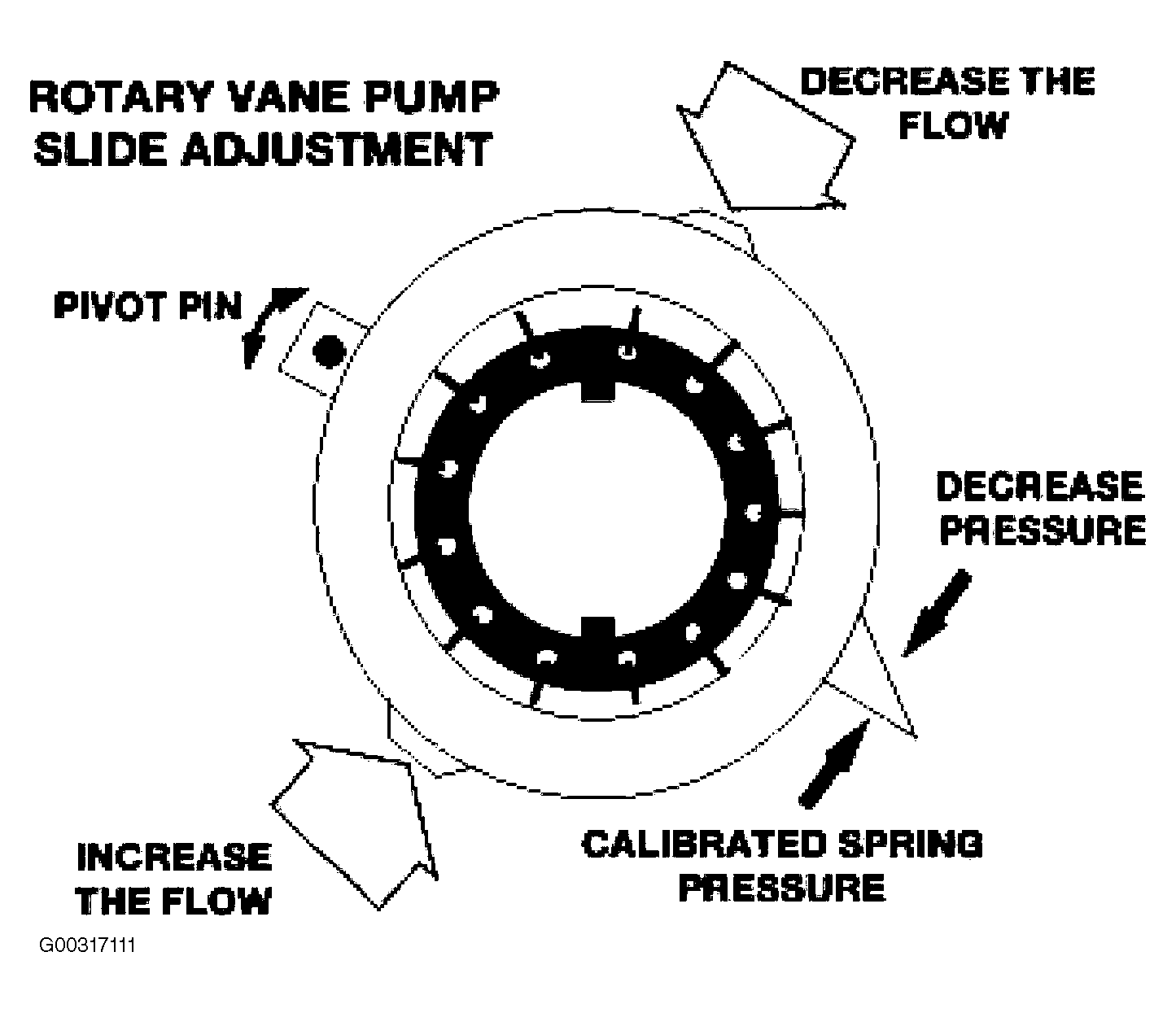 The A5S 360R uses a vane pump to provide the transmission main line oil supply for operation and cooling requirements. See Fig 1 . The pump rotor is mechanically driven by the torque converter oil pump drive tangs at 1:1 engine speed rotation providing pump operation. The rotor with 13 vanes is located in a recess on the rear surface of the bell housing covered by the pump cover plate. The rotor and vanes are placed inside a slide mechanism. As the rotor spins, the vanes "sweep" the oil from the pump intake to the output along the mating surface of the vane ends and the interior surface of the slide. The slide is mounted on a pivot pin. As it pivots, it changes the eccentricity of the rotor to slide mating surface changing the pump output volume. The slide's position is influenced by a calibrated spring and hydraulic input pressure from the main pressure regulator solenoid in the valve body. The benefit of changing the slide position is to optimize pump output volume to meet the needs of the operating conditions. See Fig 2 .