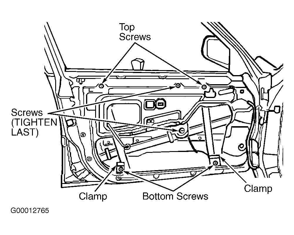 Install window regulator in locating bracket. Install and tighten 2 top screws. See Fig 1 . Install bottom of door window in window regulator clamps. Lower door window down to stop. Tighten 2 lower screws. Close door window firmly. Tighten 2 remaining screws.