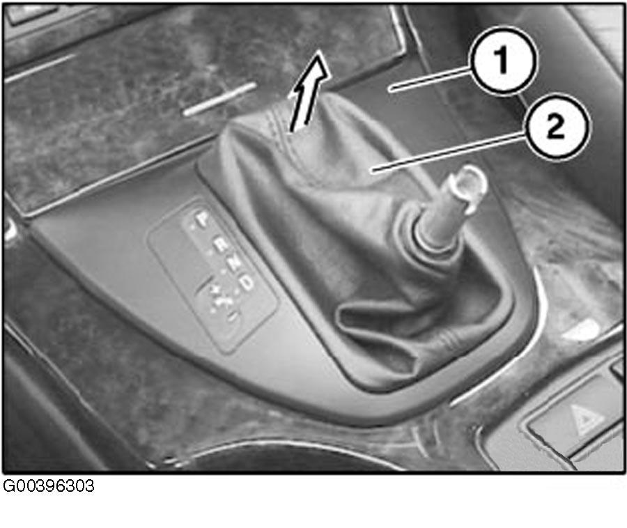 Remove trim (1) with rubber gaiter (2) from center console. See Fig 1.