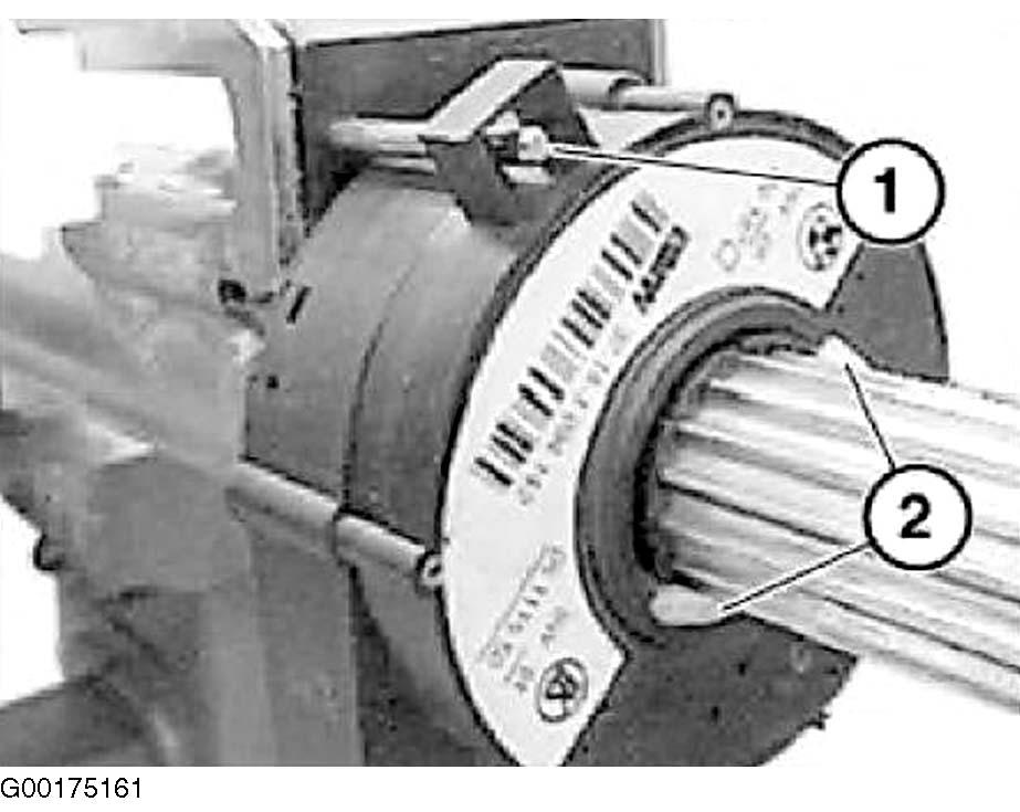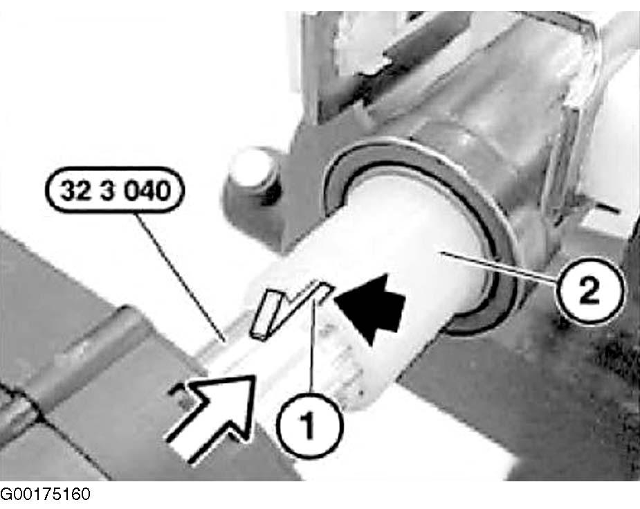 4. Push in steering spindle upper section until stop. Locate special tool (32 3 040) with steering angle sensor. Both lugs (1) of special tool must engage in openings of bearing (2). Push on steering angle sensor. See Figure.