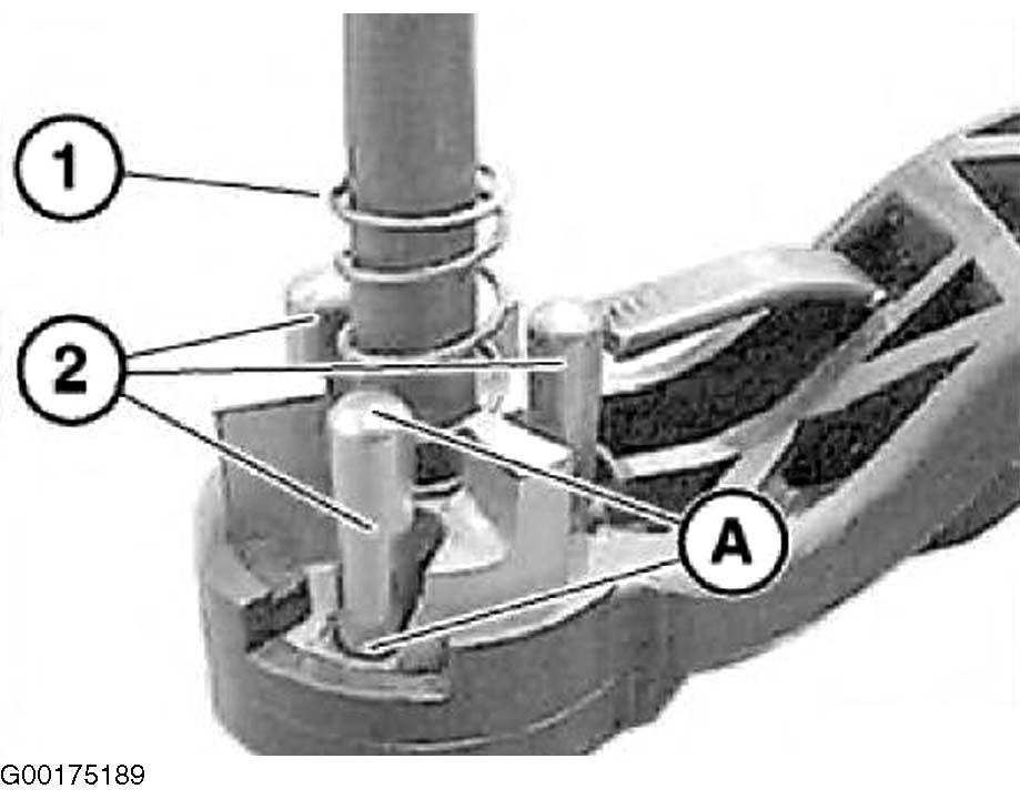 13. Grease contact area (A) and position rollers (2) vertically in operating lever. Note position of spring (1). See Fig 4.