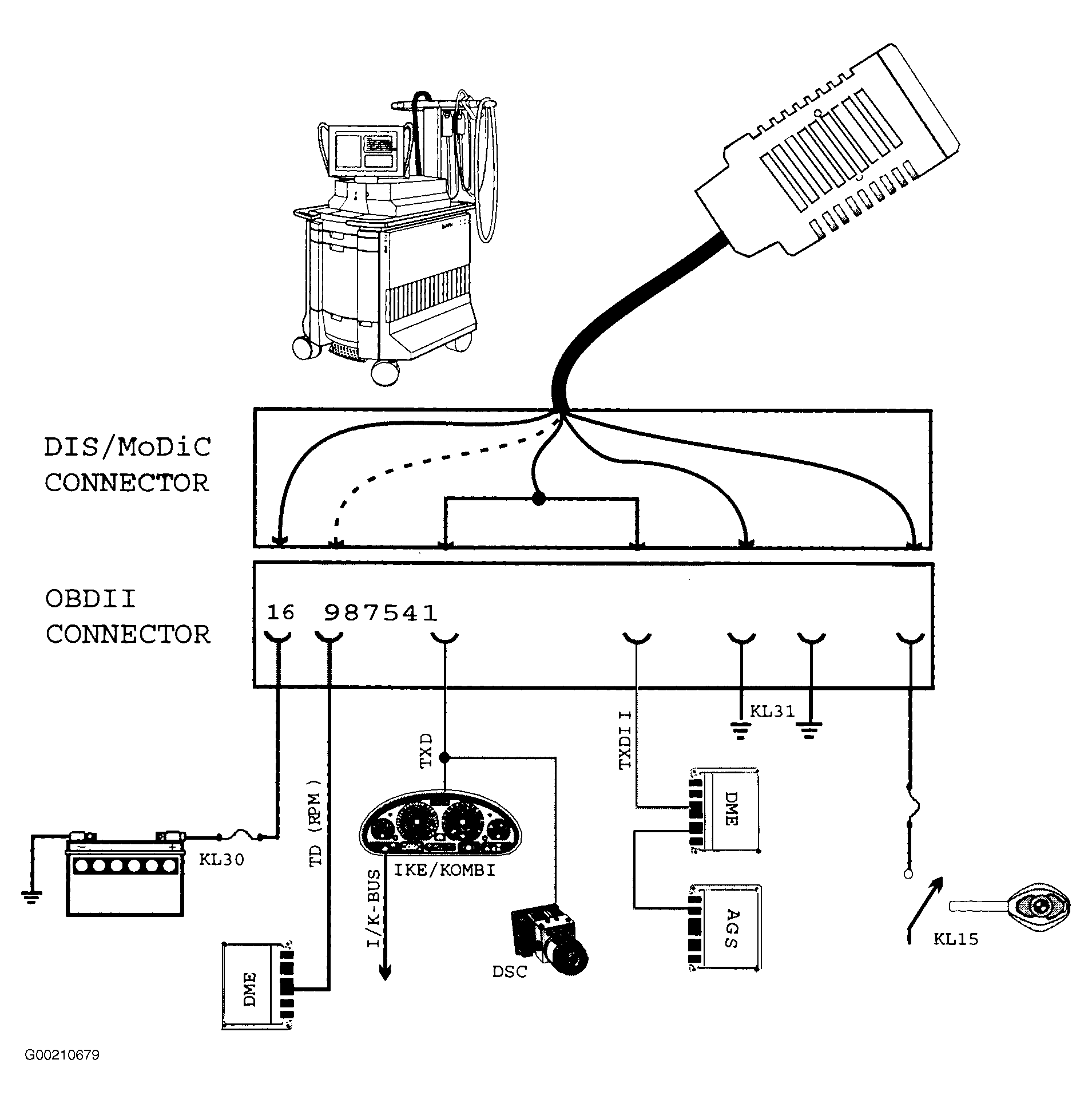 On 7-series vehicles, diagnosis tool is connected to the vehicle at the OBD-II diagnosis connector (On-Board Diagnosis). The connector is located behind a small cover in the drivers side lower "A" pillar trim. There is a black plastic cap that bridges KL30 to the D-bus when the connector is not being used. This cap must be removed before installing the diagnosis cable. The TXD lead is located in pin 7 of the OBD socket and is connected directly to the ZGM. The ZGM detects by means of the data transmission speed whether a BMW diagnosis tool (DISplus, GT-1) or an aftermarket scanner is connected. The PCM allows access to different data depending on diagnosis tool connected. When using an OBD-II scan tool for diagnosis, the transmission speed is 10.4 KBit/s. See Fig 2.