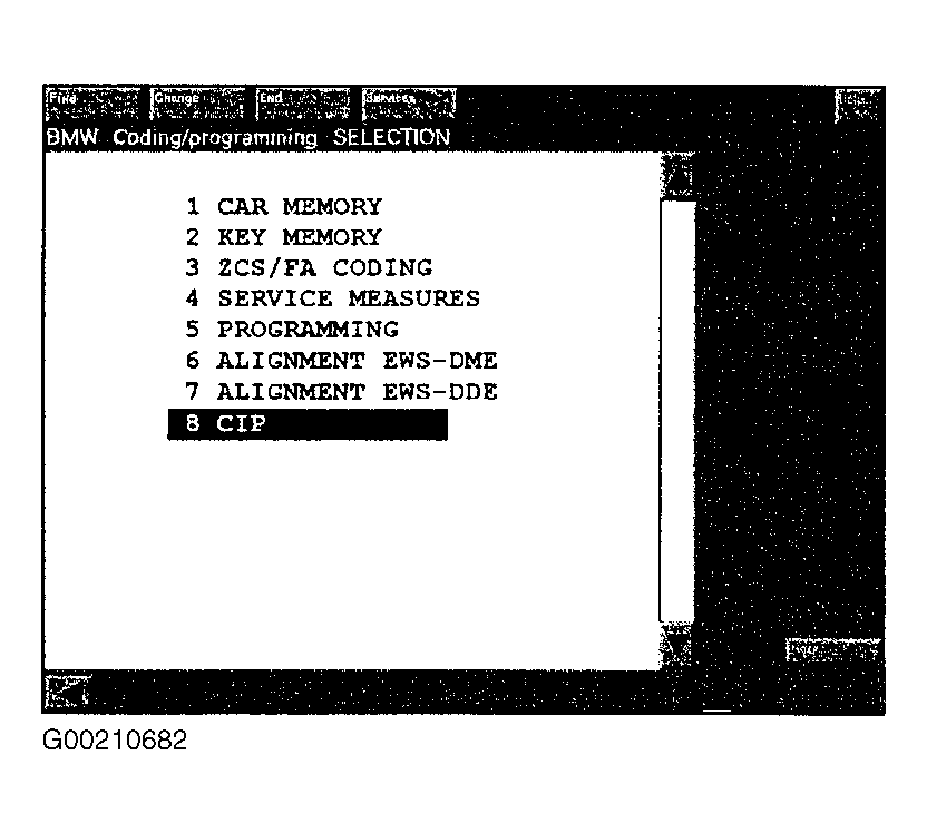 Program start using DISplus or GT-1 with diagnostic head connected to vehicle. Select CODING/PROGRAMMING from start mask. When program is started for the first time after a CD installation, there is a longer wait time (about 90 seconds). Start CIP by selecting "8 CIP", then press the forward arrow. See Fig 1. The initial CIP screen is then displayed. After startup, CIP determines the Vehicle Order (VO), previously known as the Central Coding Key (ZCS) and records which control modules are installed in the vehicle. The vehicle order is not displayed on the screen.