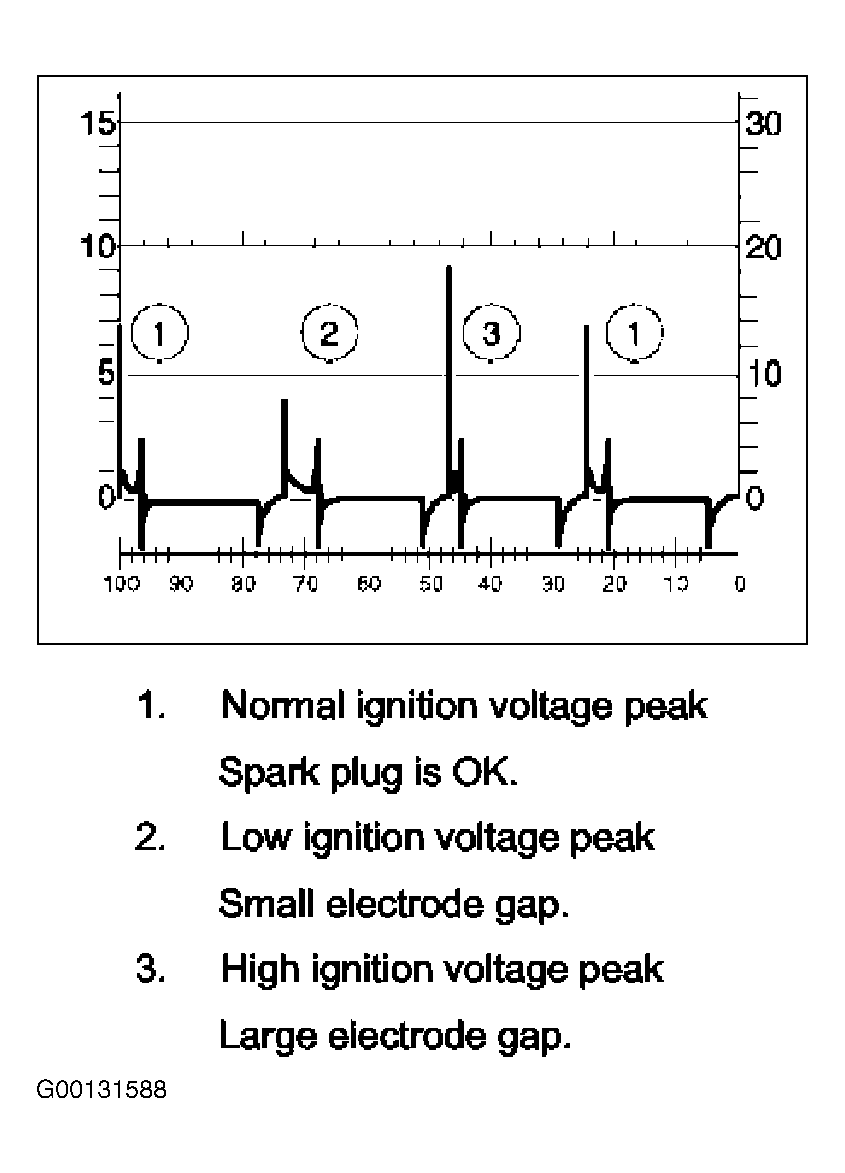 1. For evaluation of sparking period at idle, voltage peak No. 1 indicates normal ignition voltage peak. Spark plug is okay. If ignition voltage peak (voltage peak No. 2) is low, electrode gap is small. If ignition voltage peak (voltage peak No. 3) is high, electrode gap is too large. See Fig 1.