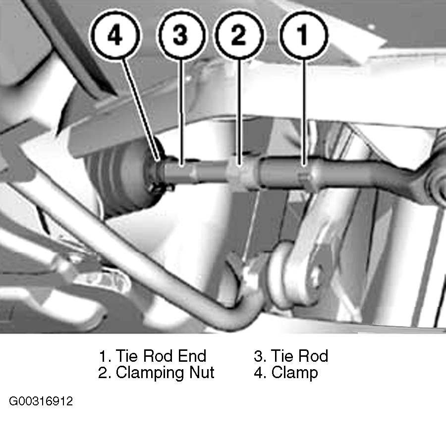 If necessary, remove steering wheel cover. Slacken clamping nut (2), gripping tie rod end (1) in the process. Remove clamp (4). Turn tie rod (3) to adjust toe-in to specified value. See Fig 1 . See WHEEL ALIGNMENT SPECIFICATIONS . Install clamp (4).