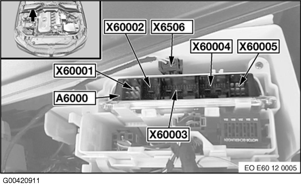 | Engine Control Module (DME) (A6000) | Right rear engine compartment. See Figure. |