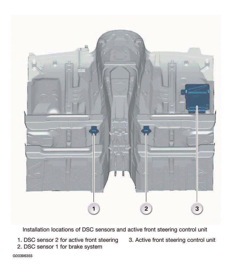 The lateral-acceleration and yaw-rate sensors are combined in a single housing and designated the DSC sensor. The active front steering system is also provided with a second DSC sensor in addition to the DSC sensor fitted as standard. DSC sensor 1 is located under the right front seat. DSC sensor 2 is located under the left front seat. See Fig 1.