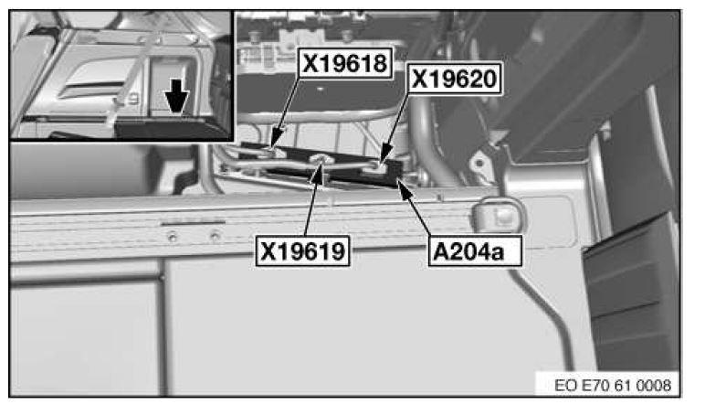 | Trunk Lid Lift Control Module (X19618/9/20) | Right side of rear compartment. See Figure. |