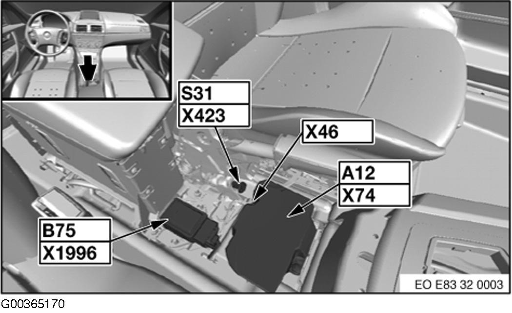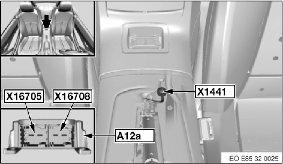 | Crash Safety Module (A12a) | Under center console. See Figure. |