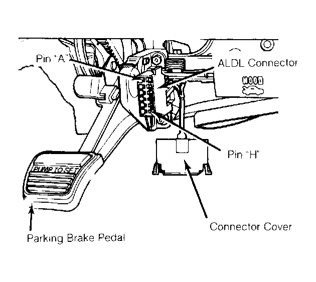 - Turn ignition on. Both warning lights should stay on for 30 seconds maximum. If "ANTI-LOCK" light stay on after 30 seconds, turn ignition off. Remove cover and place a jumper wire between ALDL terminals "A" and "H". ALDL connector is located just right of parking brake pedal. See Fig 1.