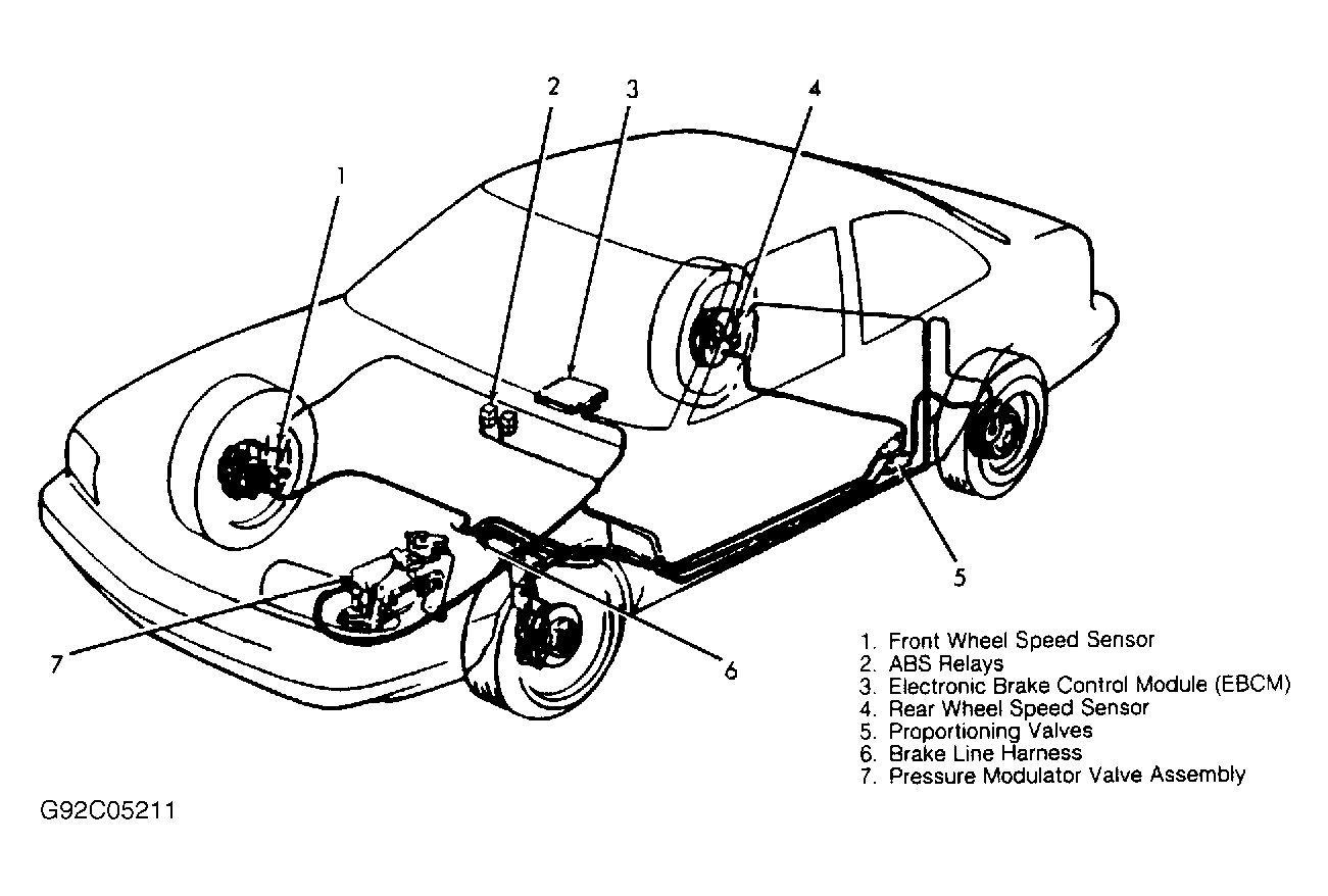 The Teves 4-wheel Anti-Lock Brake System (ABS) and Traction Control System (TCS) are designed to prevent wheel lock-up during heavy braking and acceleration slip at speeds less than 25 MPH. The ABS allows driver to maintain steering control while stopping vehicle in shortest distance possible, while TCS allows fast acceleration. Major components include the following: pump motor, Pressure Modulator Valve (PMV) assembly, fluid reservoir with integral filter, wheel speed sensors (4), fluid level sensor, Electronic Brake Control Module/Electronic Brake Traction Control Module (EBCM/EBTCM), brake booster/master cylinder assembly and BRAKE and ANTI-LOCK warning lights. See Fig 1 .