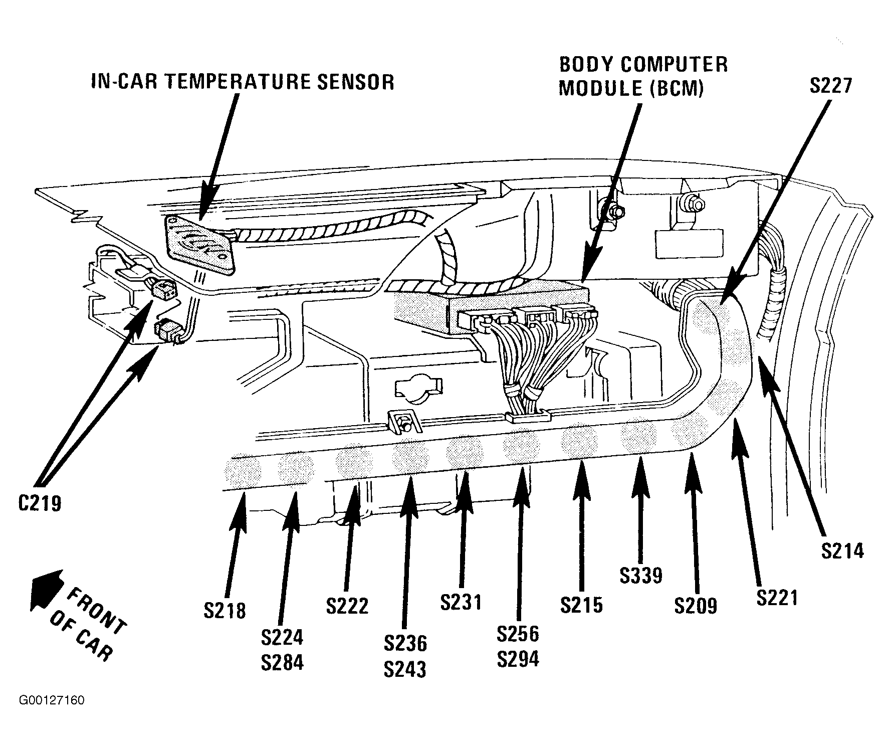 | S227 | In Dash Harness, Behind Right Side Of Instrument Panel, At Shroud, In Dash Channel. See Fig 1 . |