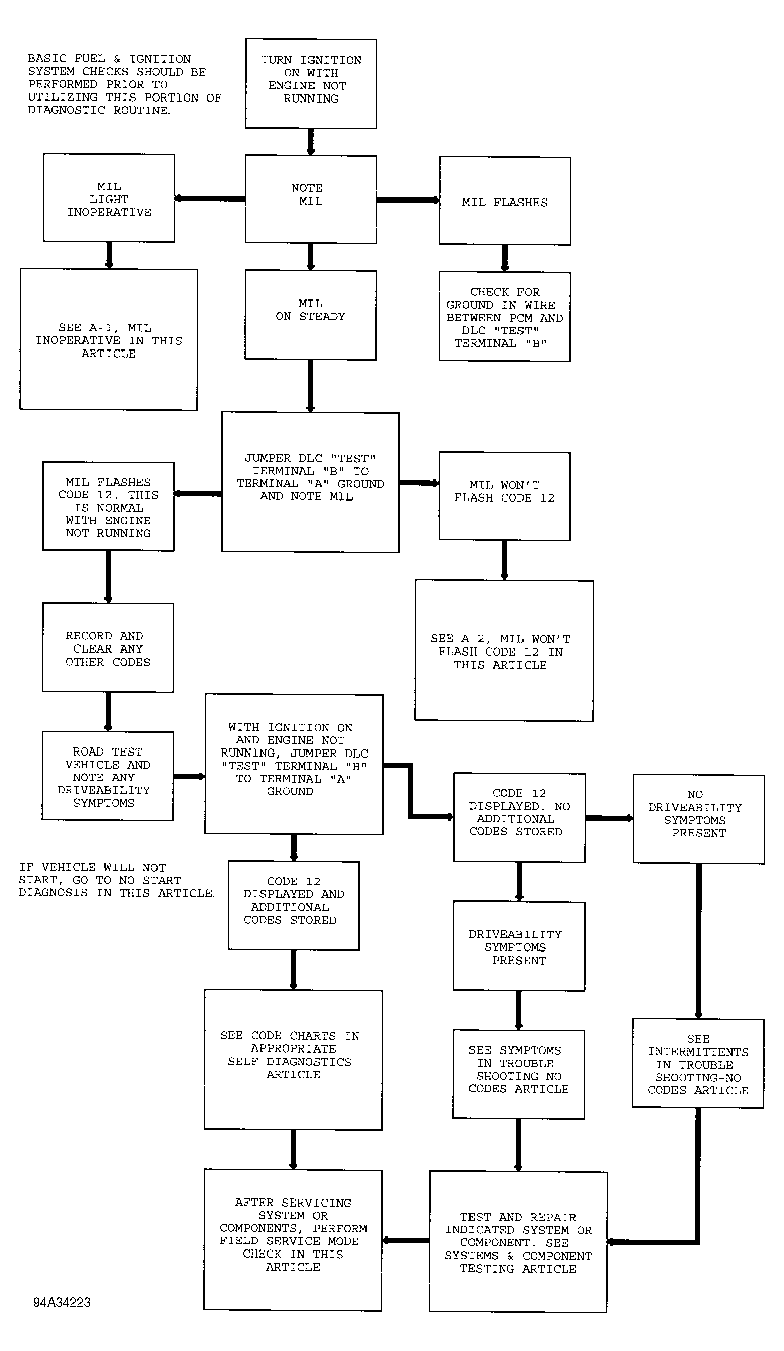 After performing procedures in PRELIMINARY INSPECTION & ADJUSTMENTS, BASIC FUEL SYSTEM CHECKS and BASIC IGNITION SYSTEM CHECKS, this is the starting point for utilizing the self-diagnostic system for determining computer-related problems. See Fig 1 and Fig 2 . After performing necessary tests as described in the diagnostic circuit check, if no codes are indicated and driveability problems still exist, see H - TROUBLE SHOOTING - NO CODES article in the ENGINE PERFORMANCE section and SCAN TESTER USAGE in TESTS W/CODES article in the ENGINE PERFORMANCE section.