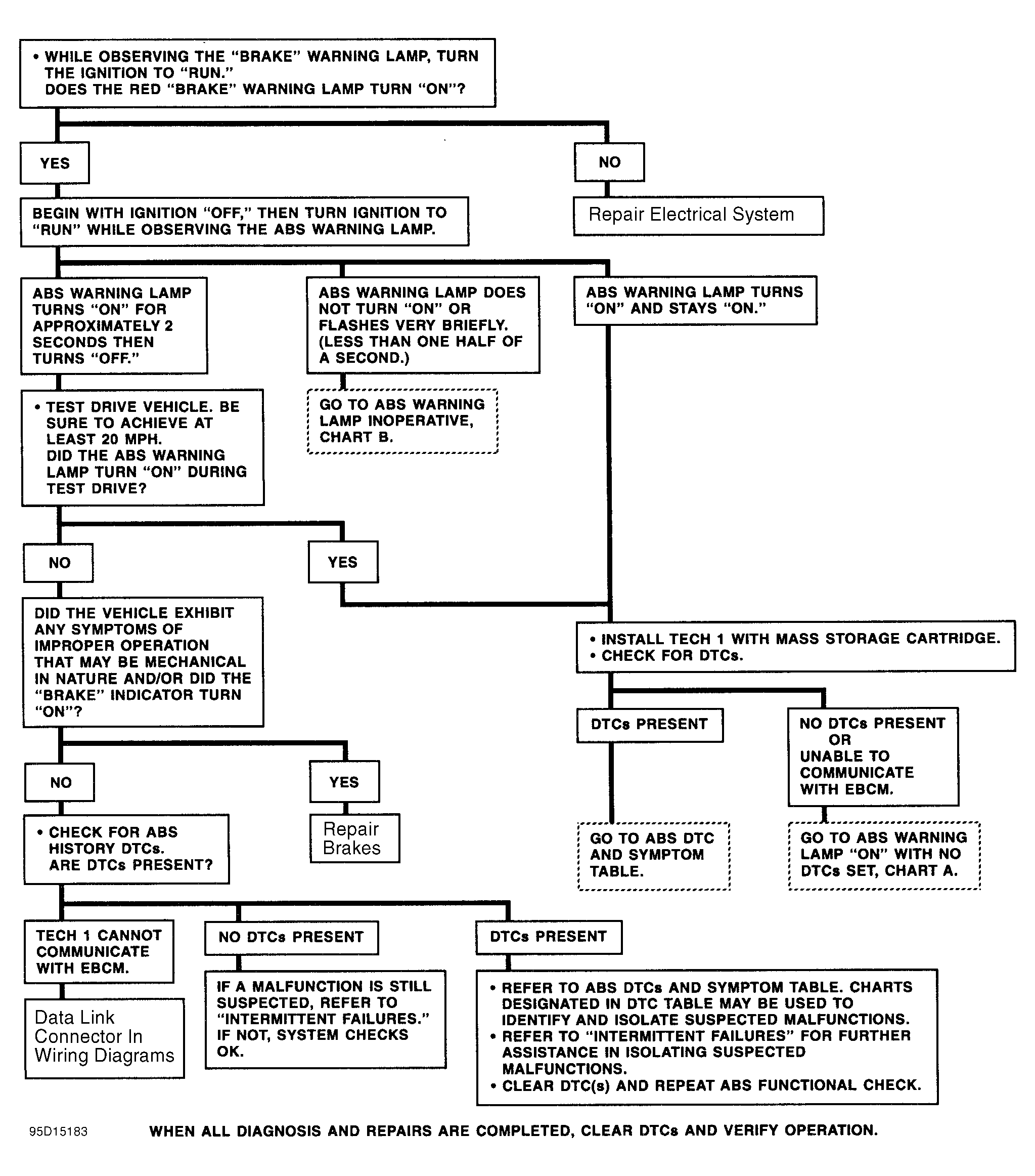 Turn ignition on. Using Tech 1, select F4: MISC TESTS and then F1: AUTO TEST. Press ENTER when ready. Valves can be heard and felt cycling from hydraulic control unit. Have assistant verify pump motor is turned on. See DIAGNOSTIC TROUBLE CODE (DTC) table if DTCs are set. See DIAGNOSTIC TROUBLE CODE CHARTS. After all diagnosis and repairs are completed, clear DTCs and verify operation. AUTO test is performed automatically by EBCM once during each ignition cycle when vehicle reaches approximately 4 MPH.