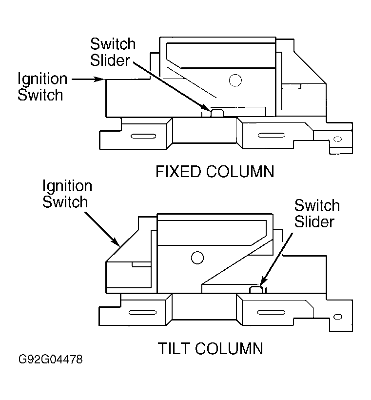 - Set key lock cylinder in OFF-LOCK position. On fixed column, set ignition switch slider (where actuator rod connects to switch) to OFF-LOCK position by moving slider as far left as possible, and then one detent to right. See Fig 1.