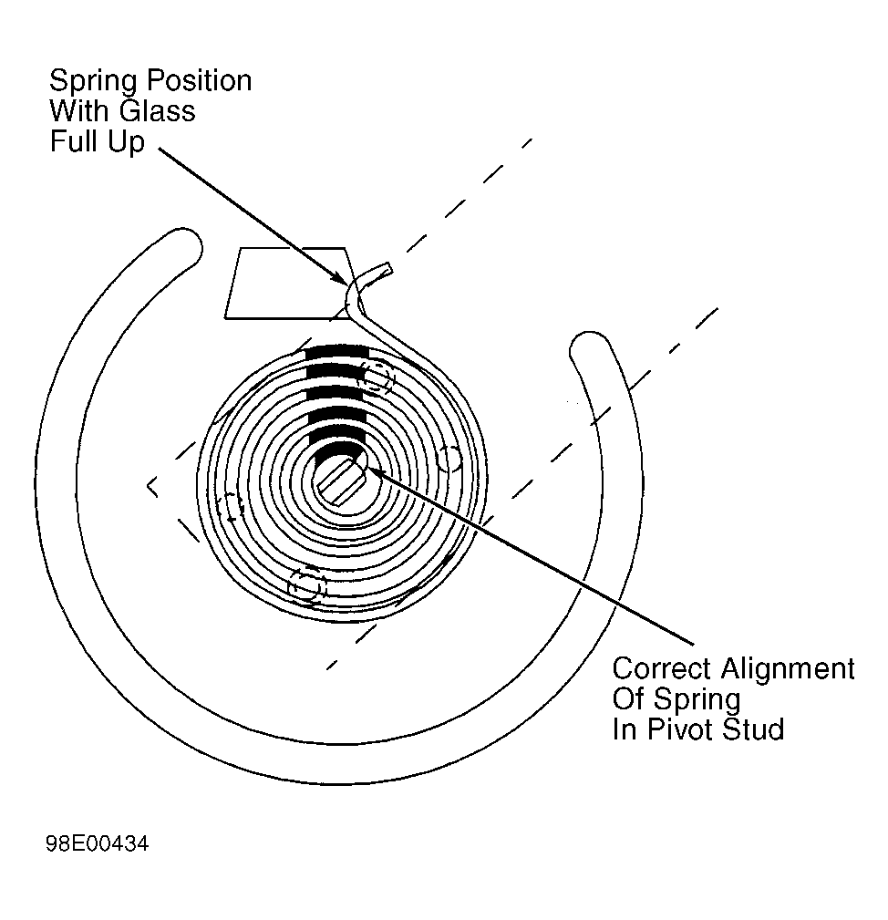 - Replace express down module. Recheck express down operation. If express down operates properly, system is okay. If express down does not operate properly, check for improperly wound window spring. To check, place left front window in full up position. Inspect window regulator counterbalance spring for proper winding. See Fig 1. If spring winding is incorrect, rewind spring.