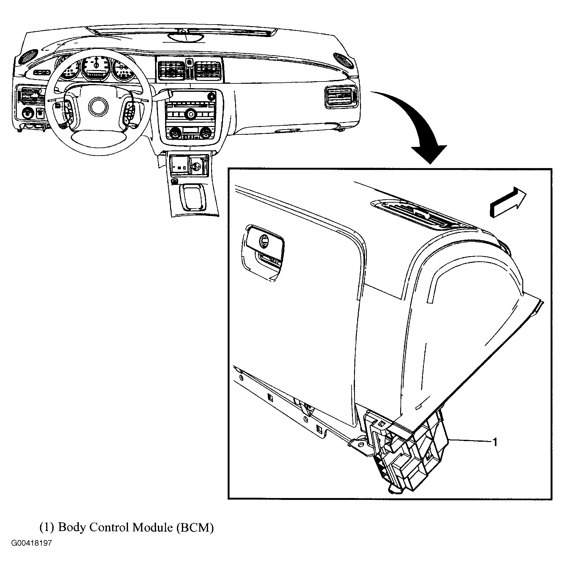 | Body Control Module (BCM) | Right of glove box. See Figure. |