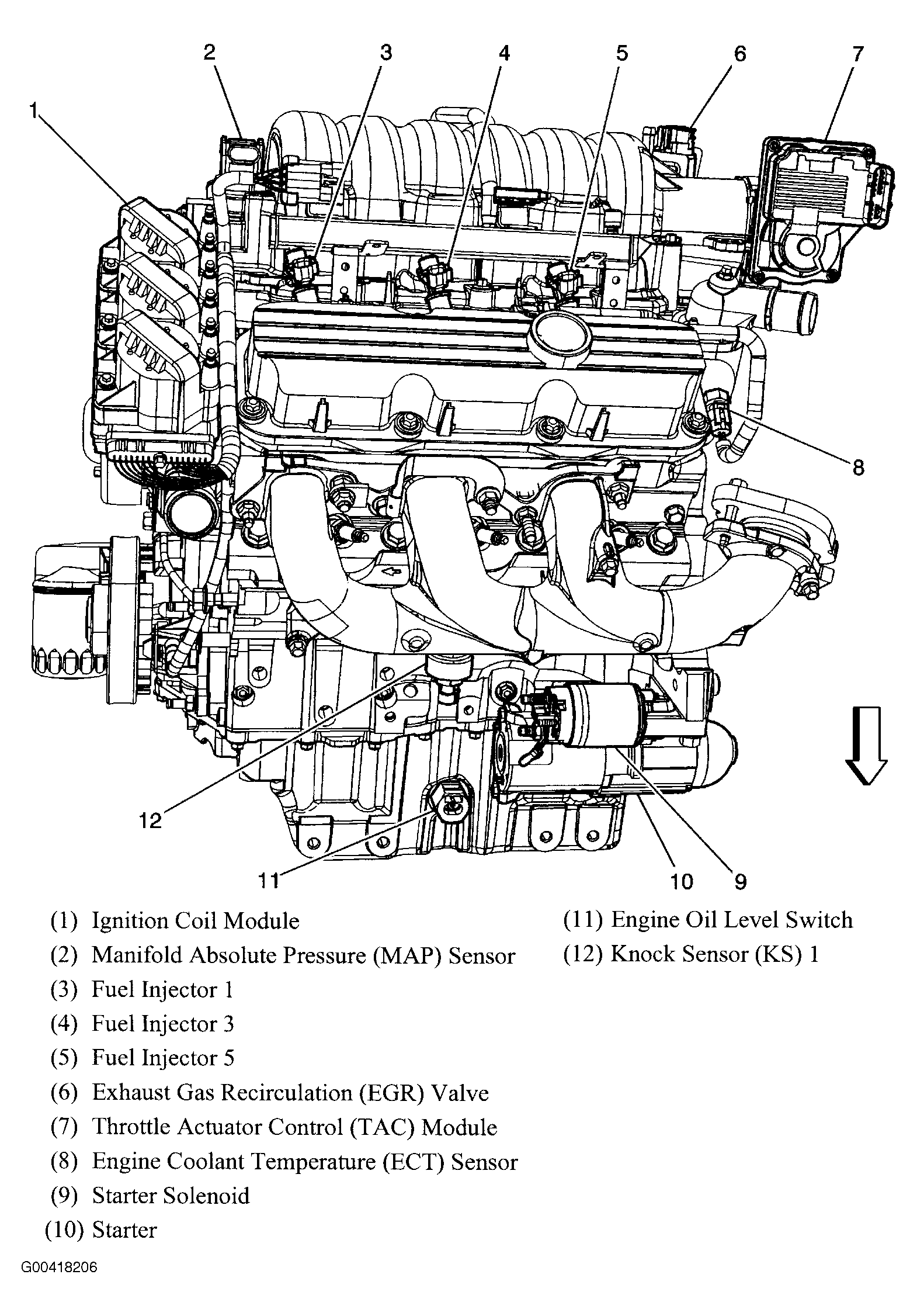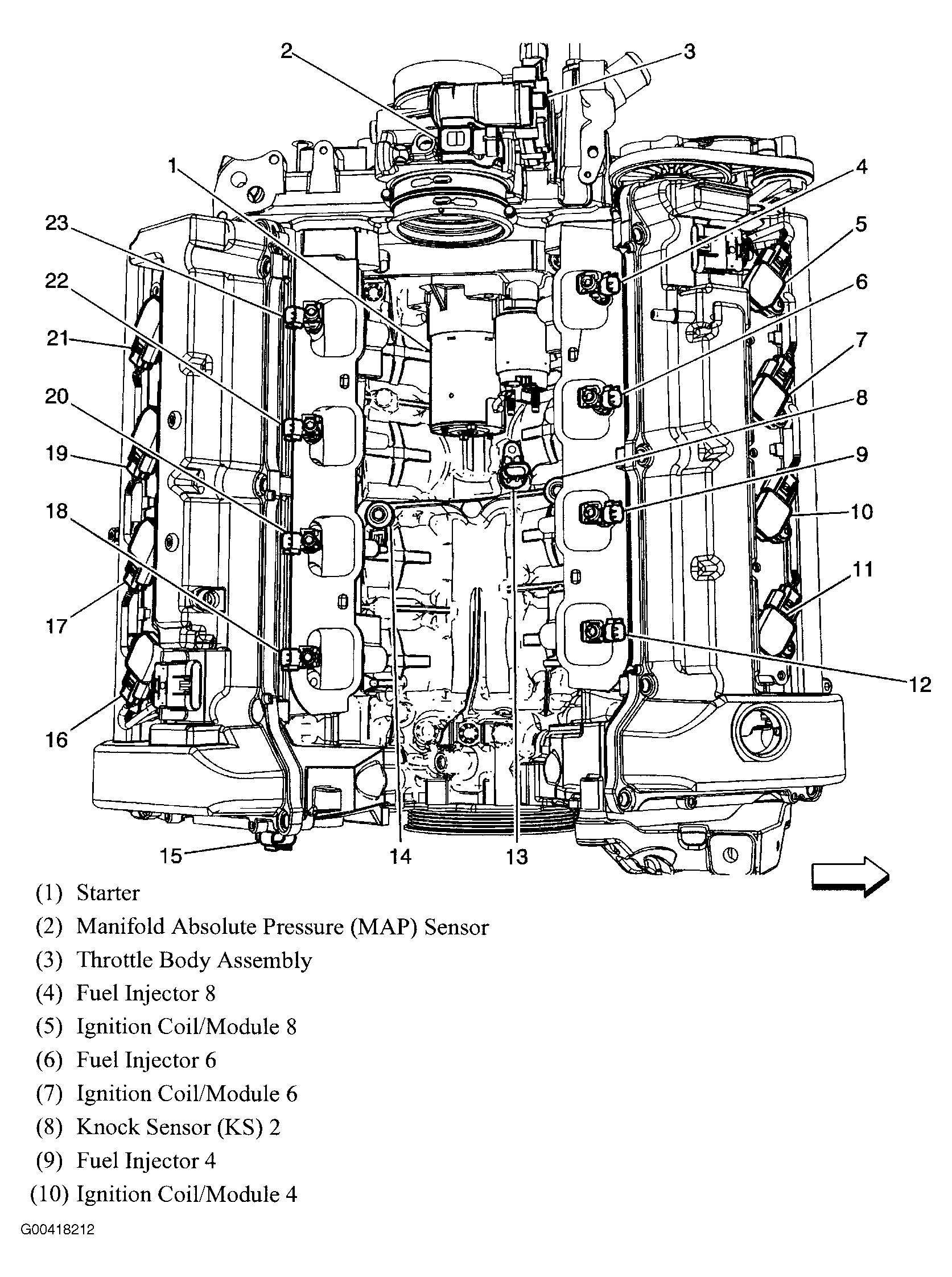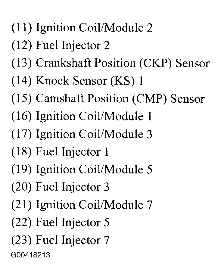 | Ignition Coil/Module 1, 3, 5 & 7 | Top right side of engine. See Figure. |