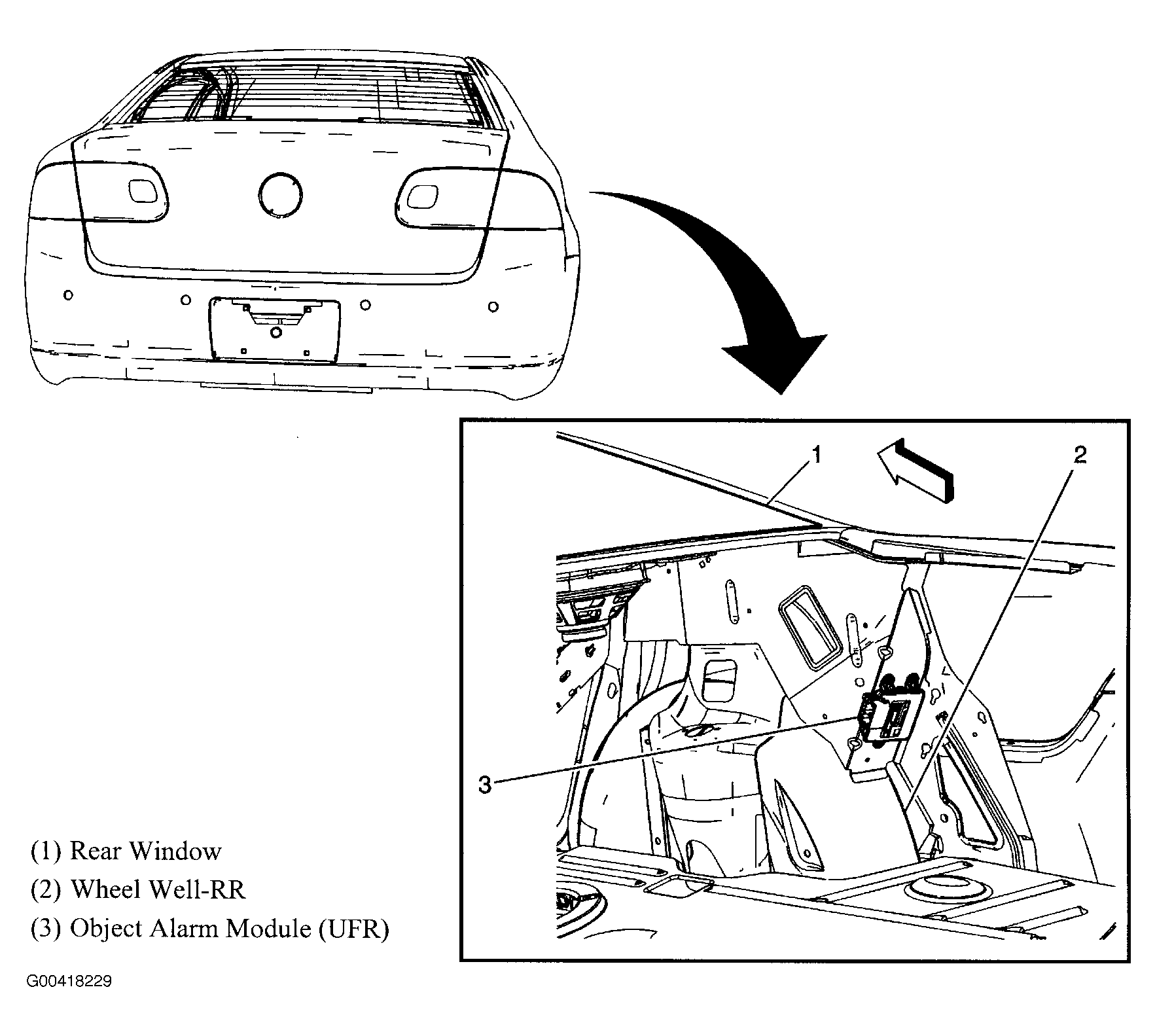 | Object Alarm Module (UFR) | On right rear wheelwell. See Figure. |