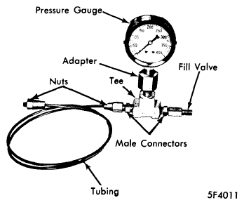 1. With ignition and all accessories off, deflate system through service valve on compressor. Remove high pressure line at regulator adapter and connect a suitable test gauge (see Figure). Inflate reservoir to 70 psi through service valve and watch test gauge for evidence of leak.