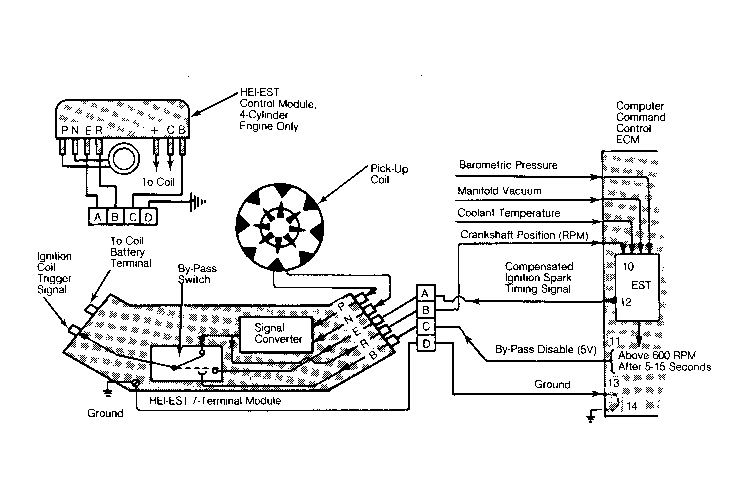 During cranking or in event of EST ECM failure, a by-pass signal from ECM terminal 11 to the HEI-EST module terminal "B" is either absent or low. See Figure. This notifies the HEI-EST module to take over control of spark advance and to ignore any EST information coming from the ECM. During this period, poor engine performance may result under some conditions, but the diagnostic "CHECK ENGINE" light will not come on.