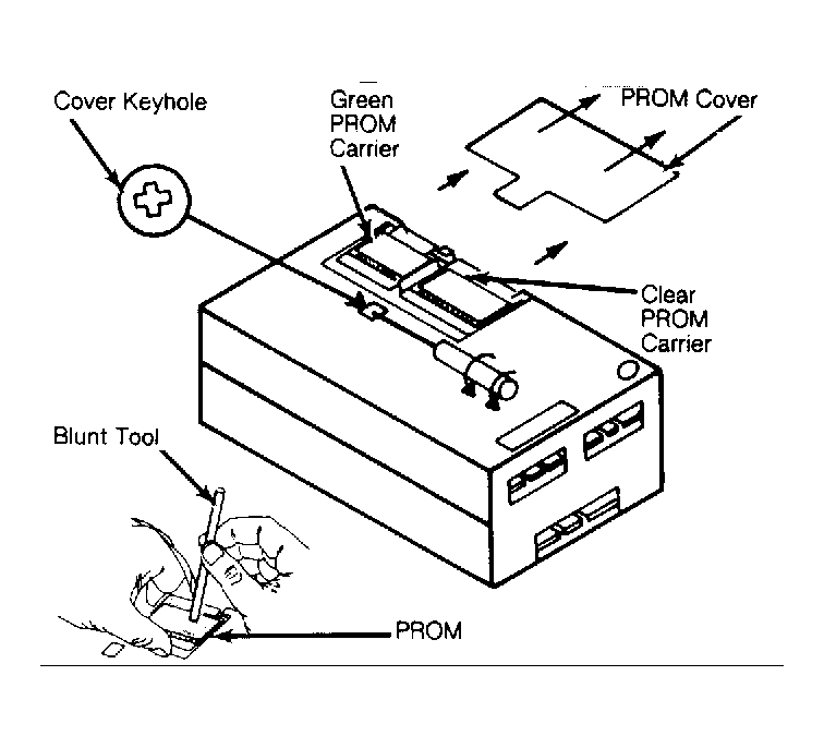 2. Position clear PROM carrier squarely over PROM socket in ECM. Firmly press down on top of carrier. While holding carrier down, press body of PROM down with a blunt tool. Alternately pressing down on either end will securely seat PROM. Repeat procedure for PROM mounted in green carrier.