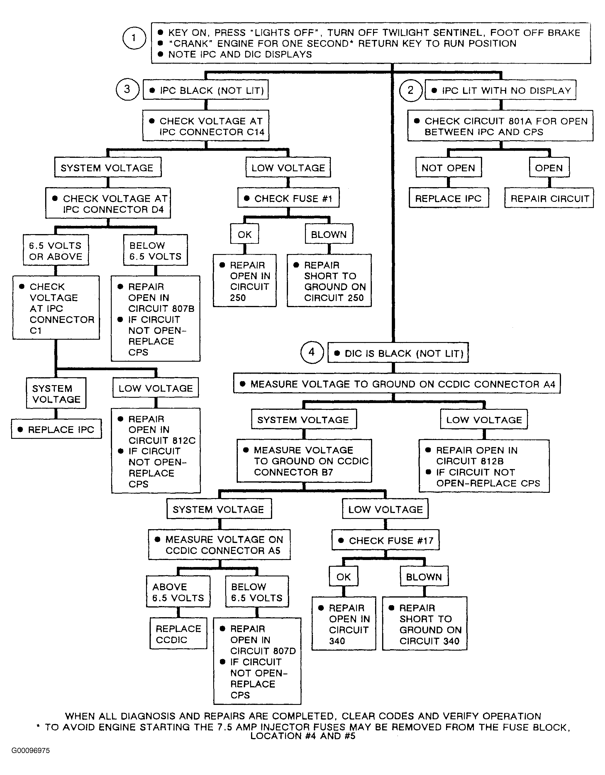 You have been sent to this chart due to display problems with the CCDIC or IPC. This chart will lead through a check of power and ground circuits to the affected display.
