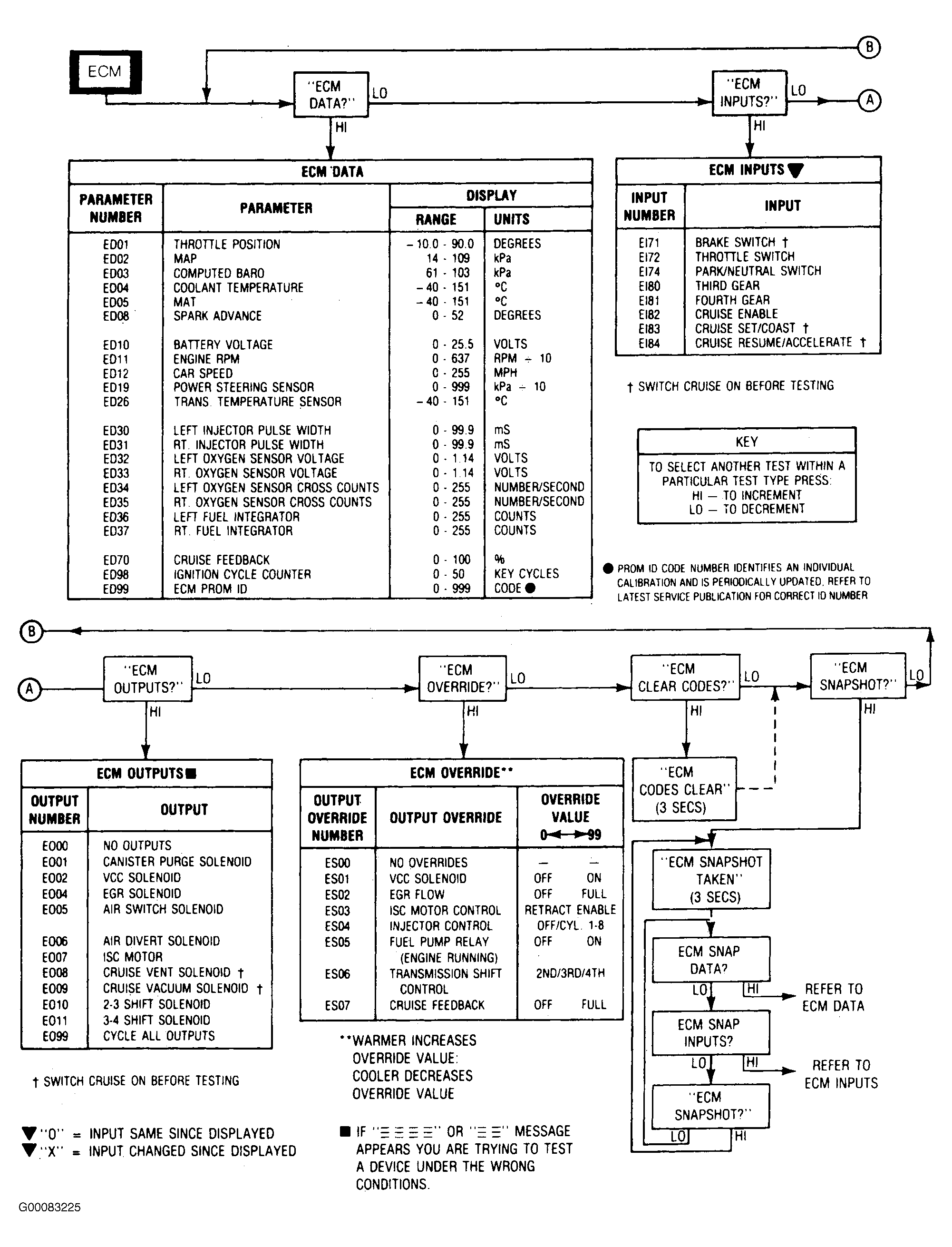 The ECM of the PFI control system has a built in diagnostic capability to constantly monitor engine/vehicle performance and operation. The diagnostic system consists of 4 test: engine malfunction test, data display, input test and output test. See Fig 1 . When diagnosing PFI system, always perform tests in the order described to determine system failures in the shortest amount of time. Description of each test is as follows:
