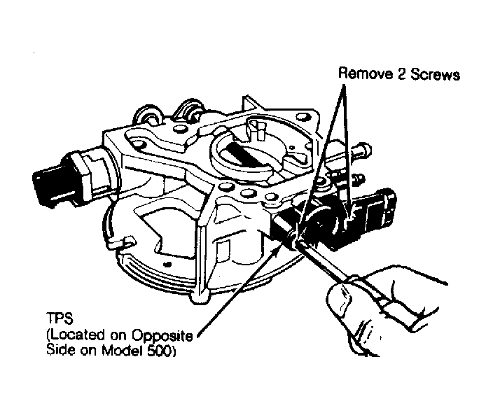 2. Invert throttle body assembly and place on clean, flat surface. Remove and discard 2 TPS attaching screws, lock washers and retainers. Remove TPS from throttle body. See Fig 1 .