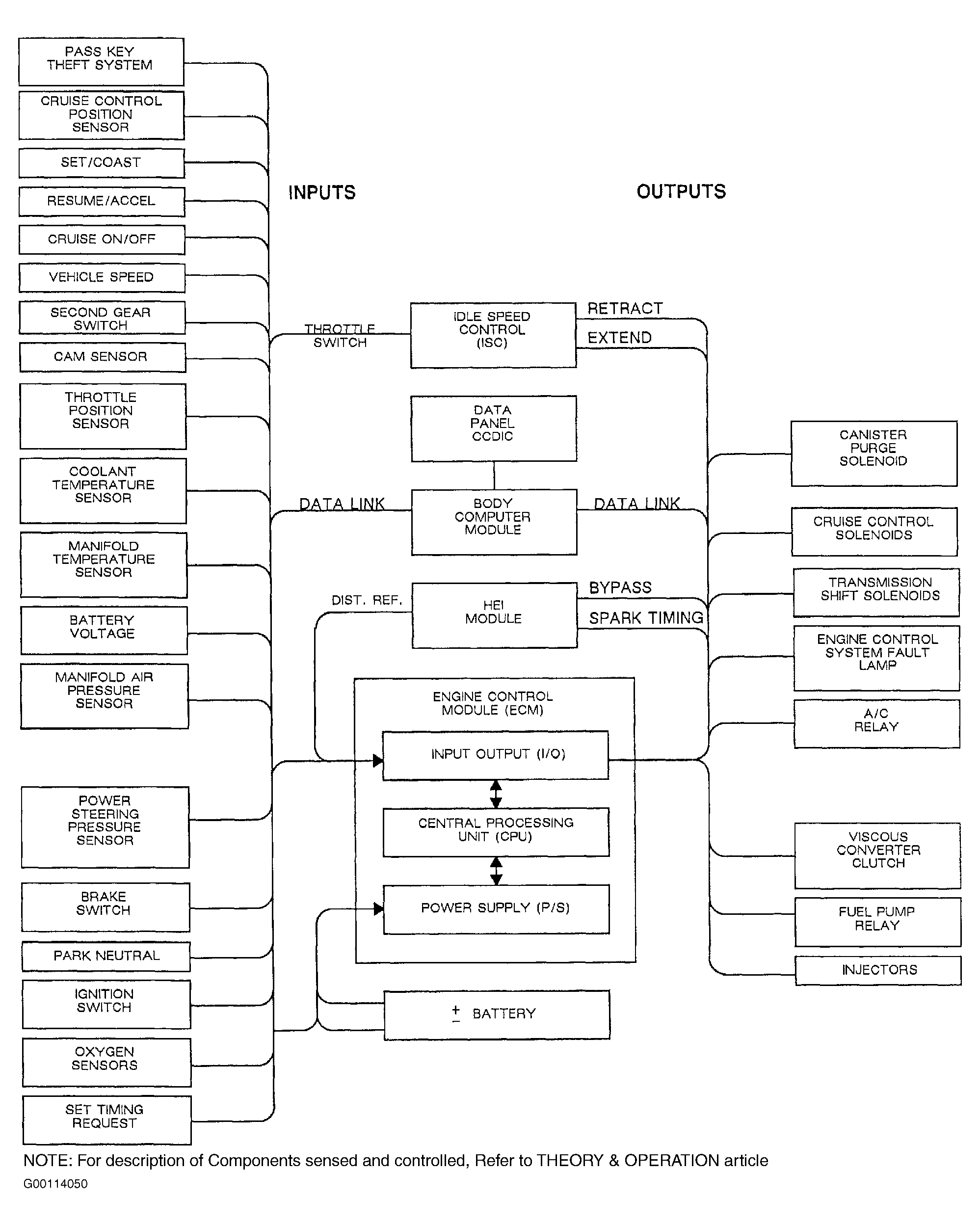 The engine used in this vehicle has controls to reduce exhaust emissions while maintaining good driveability and fuel economy. An Engine Control Module (ECM) is the heart of this control system. Fig 1 has a list of sensors and inputs the ECM uses to get information about engine operation and the various systems it controls. Details for basic operation, see THEORY & OPERATION article, for diagnosis and service, see 1989 SYSTEM & COMPONENT TESTING article.