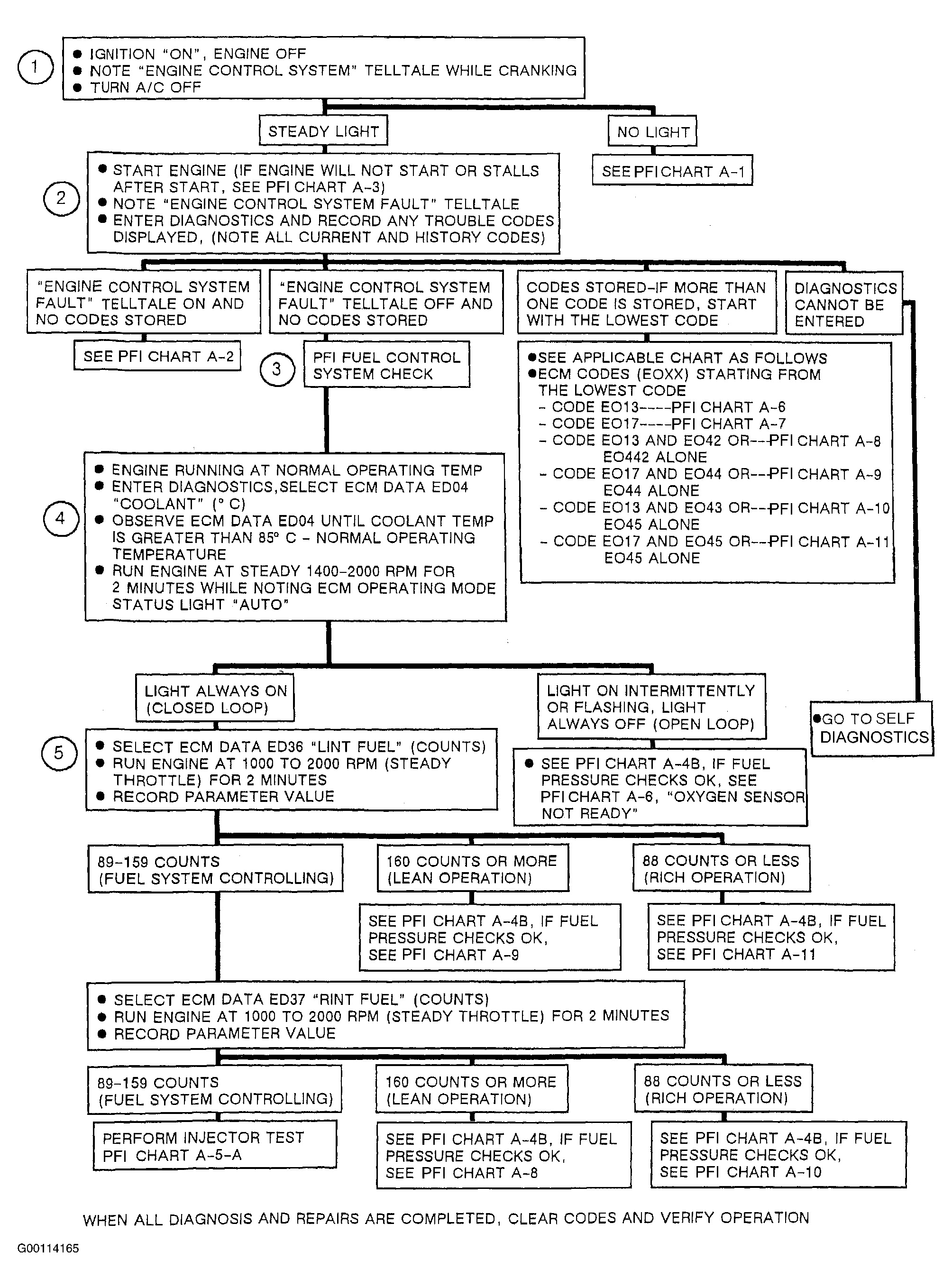 - If closed loop is achieved, the fuel system has to be checked for rich, lean or proper fuel control. The 1990 Allante PFI system has ECM Data ED36 and ED37 "Integrator" which monitors the oxygen sensor rich/lean status and drives the fuel system richer if the oxygen sensor is lean and leaner if the sensor is rich. The integrator has a range of 51 counts to 204 counts. The integrator value will be 128 when the ECM does not have to modify the fuel rate to the engine. The integrator will reset to 128 if the fuel system is in acceleration, power enrichment, some deceleration or open loop modes. (Integrator "resets" to 128 when oxygen sensor is not in control of fuel). If the integrator sees an oxygen sensor that is lean most of the time, the integrator value will go higher to try and add more fuel to the engine. If the integrator sees an oxygen sensor that is rich most of the time, the integrator value will go lower to try and drive the fuel system leaner. In this test, operate the engine at closed loop, 1000-2000 RPM with STEADY THROTTLE to stabilize the integrator reading of 88-160. In most cases, this will indicate that the fuel delivery system is OK.