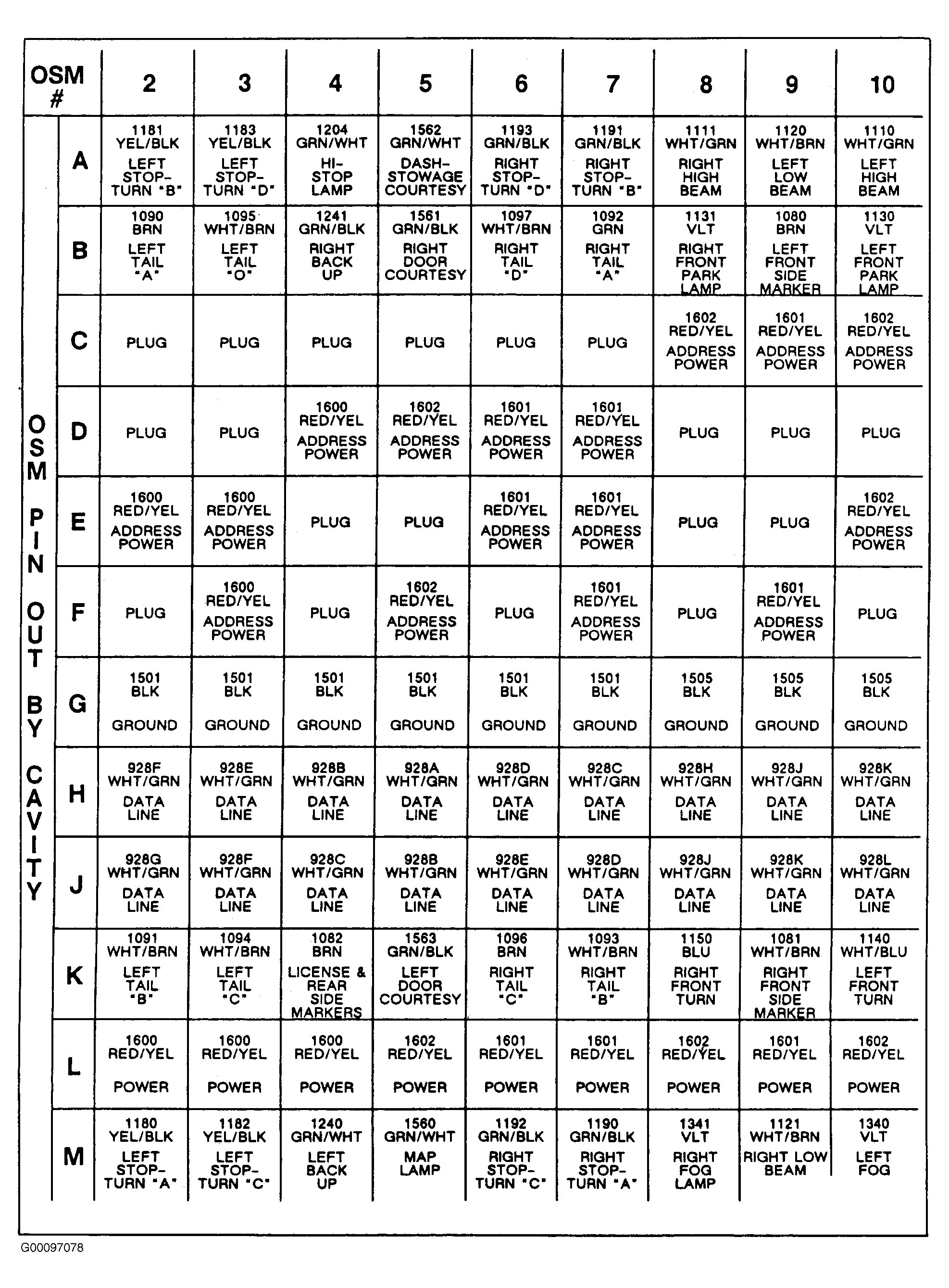 In order for an OSM to know which commands from the BCM it is to respond to, it must have an "Address". The OSM's are addressed by the vehicle wiring harness through the presence or absence of a wire (voltage) on OSM pins C, D, E, or F. Any pin without a wire will have a plastic "Plug" in that cavity or pin location. Each of these four pins has a different "Value", the total of all the pin values with a wire is the OSM number or address. The OSM "Value" for pin C is 8, D is 4, E is 2, and F is 1. For example, an OSM with a "Plug" at pin C and F and with wires at D and E would be OSM No. 6 (D=4, E=2, 4+2=6). Specific OSM addresses are detailed for each OSM in Figure .