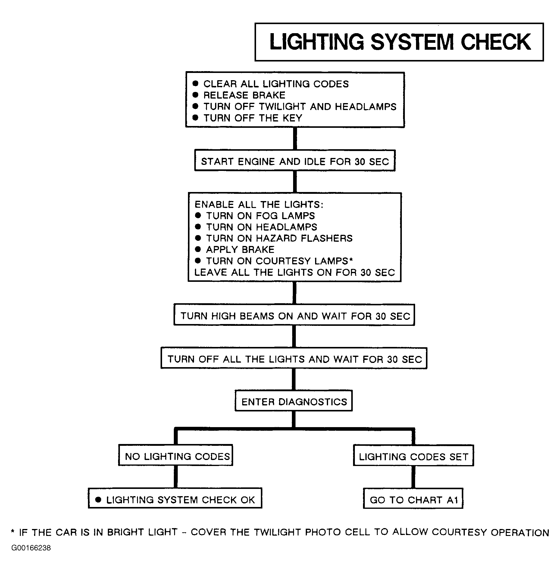 Begin lighting system system diagnosis with Lighting System Check. See Fig 1 .To retrieve diagnositic codes, see SELF-DIAGNOSTIC SYSTEM  .