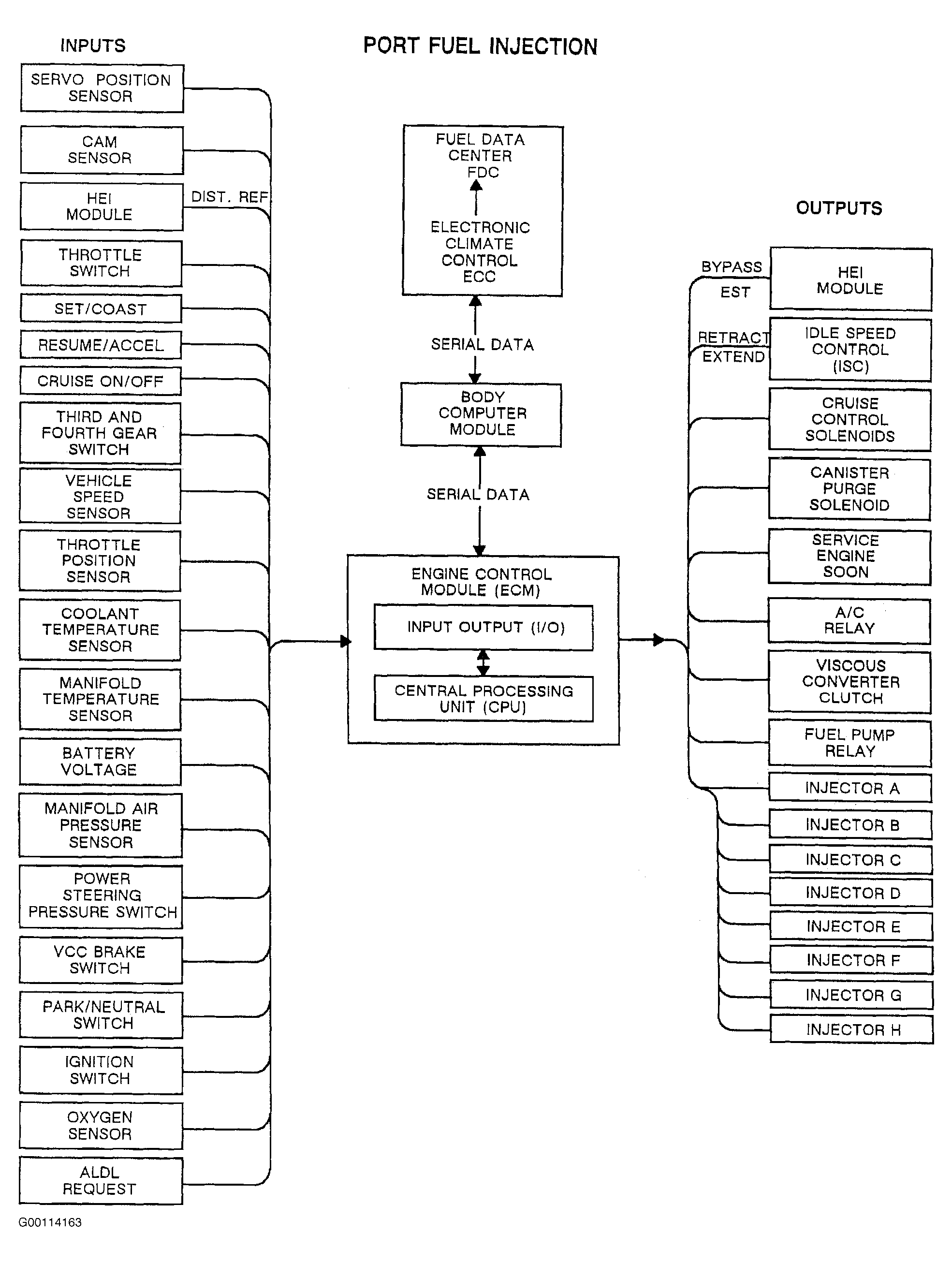 The engine used in this vehicle has controls to reduce exhaust emissions while maintaining good driveability and fuel economy. An Engine Control Module (ECM) is the heart of this control system. Fig 1 has a list of sensors and inputs the ECM uses to get information about engine operation and the various systems it controls. For details for basic operation, see THEORY & OPERATION article, for diagnosis and service, see SYSTEM & COMPONENT TESTING article.